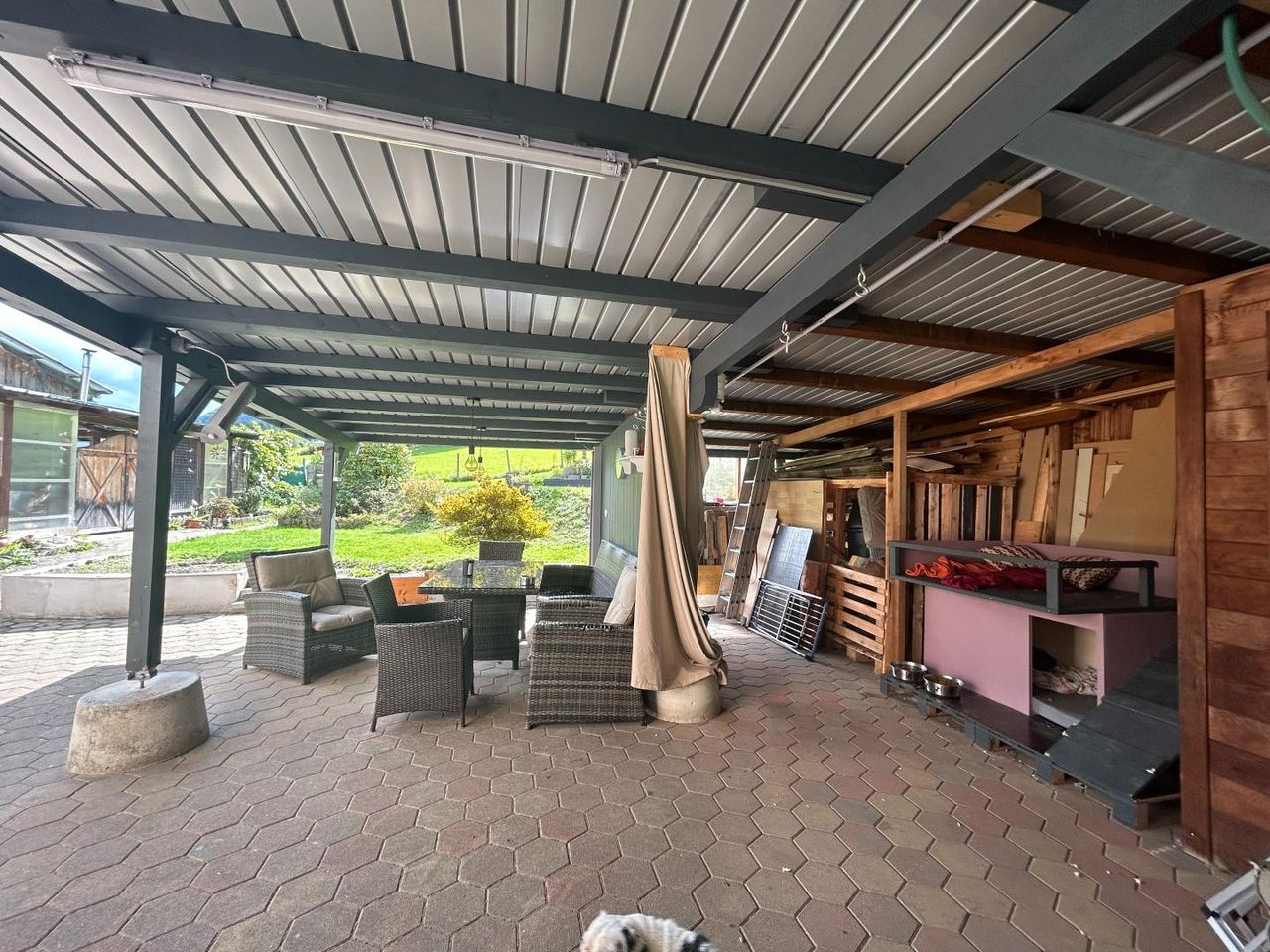 Die gemütliche, überdachte Sitzlounge lädt zum Verweilen ein.