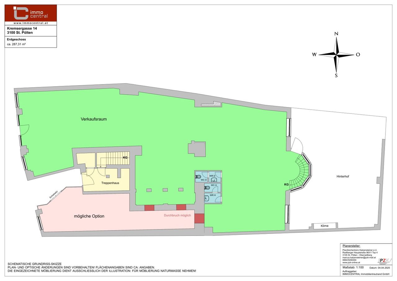 Flächenangaben und Barrierefreiheit: Der Zugang zur Immobilie erfolgt direkt über die Kremser Gasse. Die Gesamtfläche beläuft sich aktuell auf etwa 356,44 m².