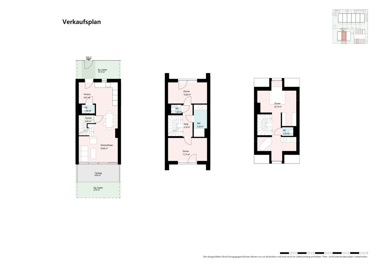 Die hier angebotene Top 102.2. ist das Reihenmittelhaus des kleinen Baukörpers und misst ca. 105,65m2 Wohnfläche | ca. 9,64m2 Terrasse | ca. 18,89m2 Garten.