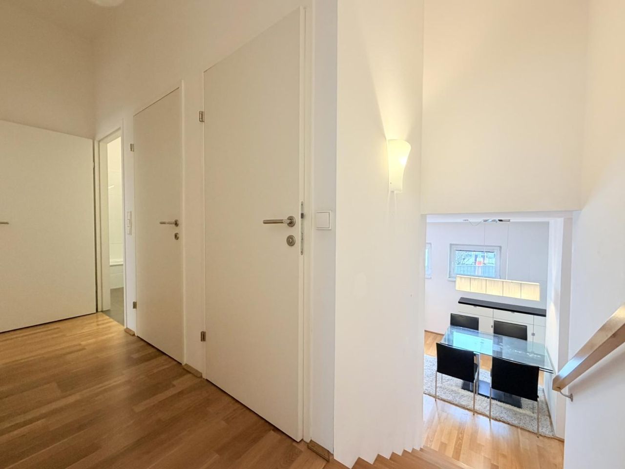 Die erste Ebene öffnet sich in einen lichtdurchfluteten 42 m² Wohnraum mit offener Küche – ideal für gemeinsames Kochen, Entspannen und gesellige Abende. Der baulich abgetrennte Eingangsbereich sorgt für angenehme Privatsphäre. Absolute Besonderheit: die großzügige, rund 44 m² große Terrasse, nach Osten ausgerichtet, perfekt für sonnige Frühstücke, Urban Gardening oder den ersten Kaffee am Morgen.