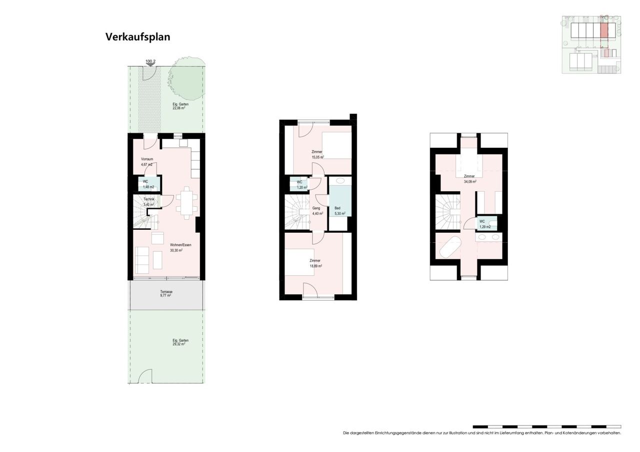 Die hier angebotene Top 100.2. ist ein Mittelreihenhaus des großen Baukörpers und misst ca. 120,07m2 Wohnfläche | ca. 9,77m2 Terrasse | ca. 51,38m2 Garten.