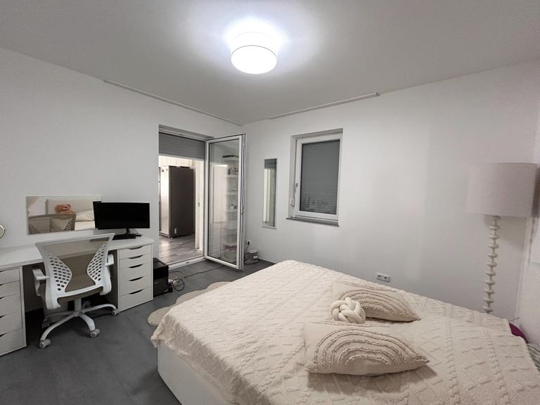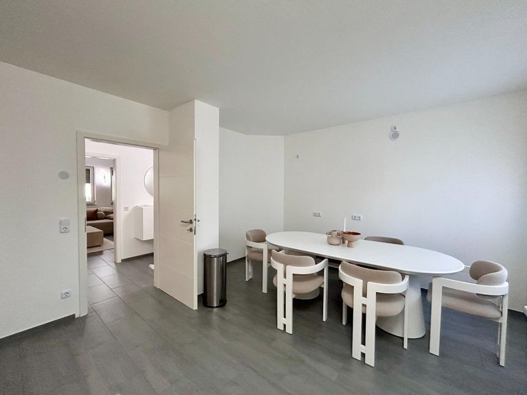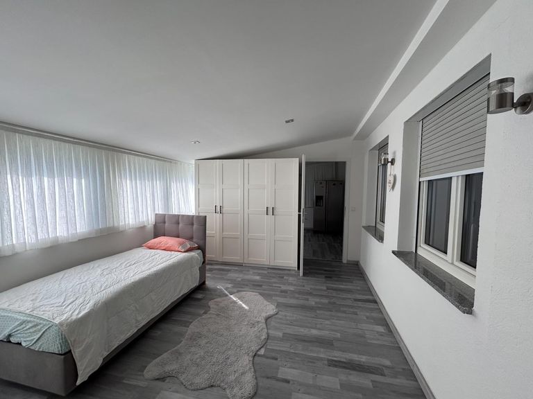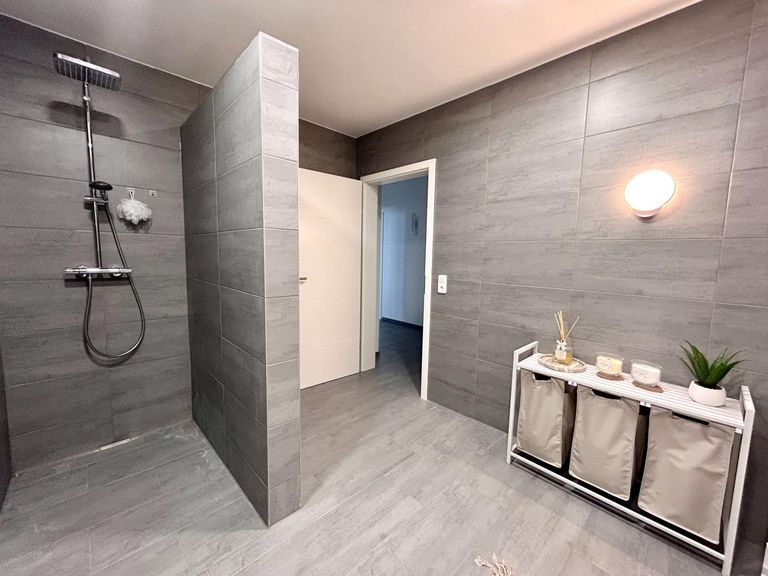 Die zweite Wohnung im Erdgeschoss ist über einen separaten Eingang erreichbar und besteht aus einer Küche inkl. Essbereich, Wohnzimmer, Schlafzimmer, Badezimmer inkl. Dusche, WC, Kinderzimmer/Büro/Arbeitszimmer und Ausgang in den Garten.