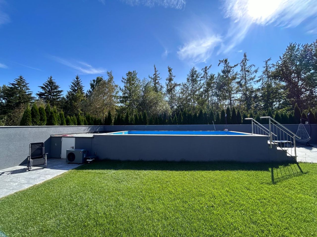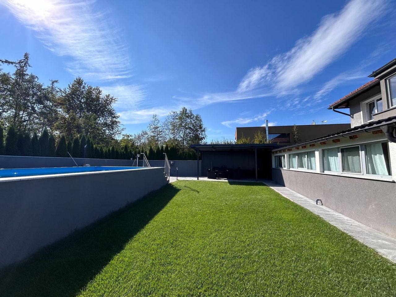 Der neu angelegte Gartenbereich inkl. überdachter Terrasse, der uneinsichtige Outdoorbereich sowie der traumhafte Poolbereich sind besonders positiv zu erwähnen und nur einige der Highlights dieser Immobilie.