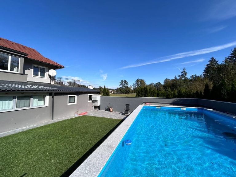 Weiters bietet das Objekt zusätzliche Parkplätze direkt vor dem Haus, eine Garage, ein Carport und genügend Platz im neu angelegten Gartenbereich. Die Liegenschaft wird mit einer Luftwärmepumpe betrieben und ist mit zwei getrennten Stromzählern ausgestattet worden. Der im Jahr 2023 errichtete Pool ist ebenfalls beheizbar und mit einem angrenzenden Technikraum ausgestattet, ein Entkalkungsgerät rundet das Angebot ab.