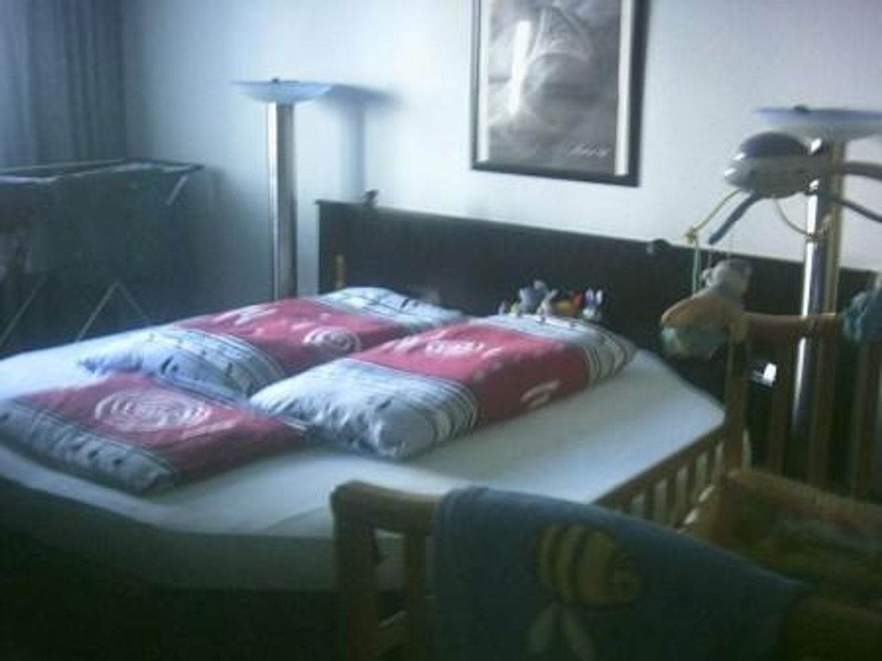 SCHLAFZIMMER (ital. Rundkasten und Eckkasten schwarz/grau, Kommode schwarz/grau, achteckiges Bett) - hofseitig, absolute Grünruhelage – Baumbestand und Wiese