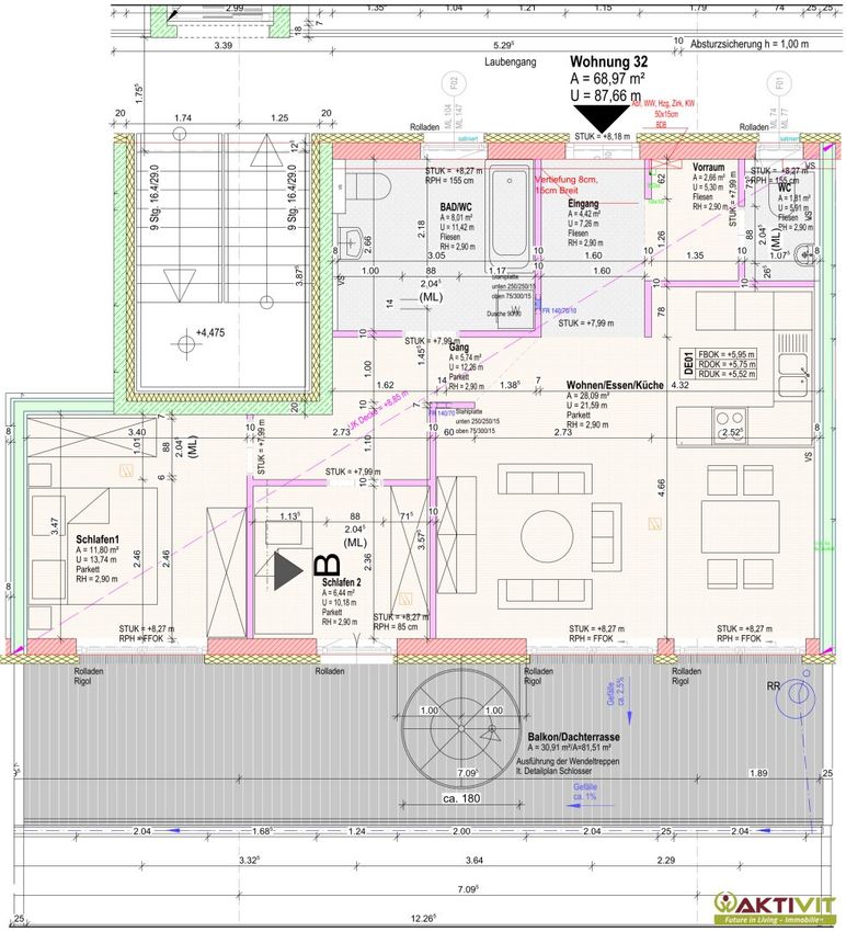 - Terrasse und Dachterrasse mit insgesamt 112 m².