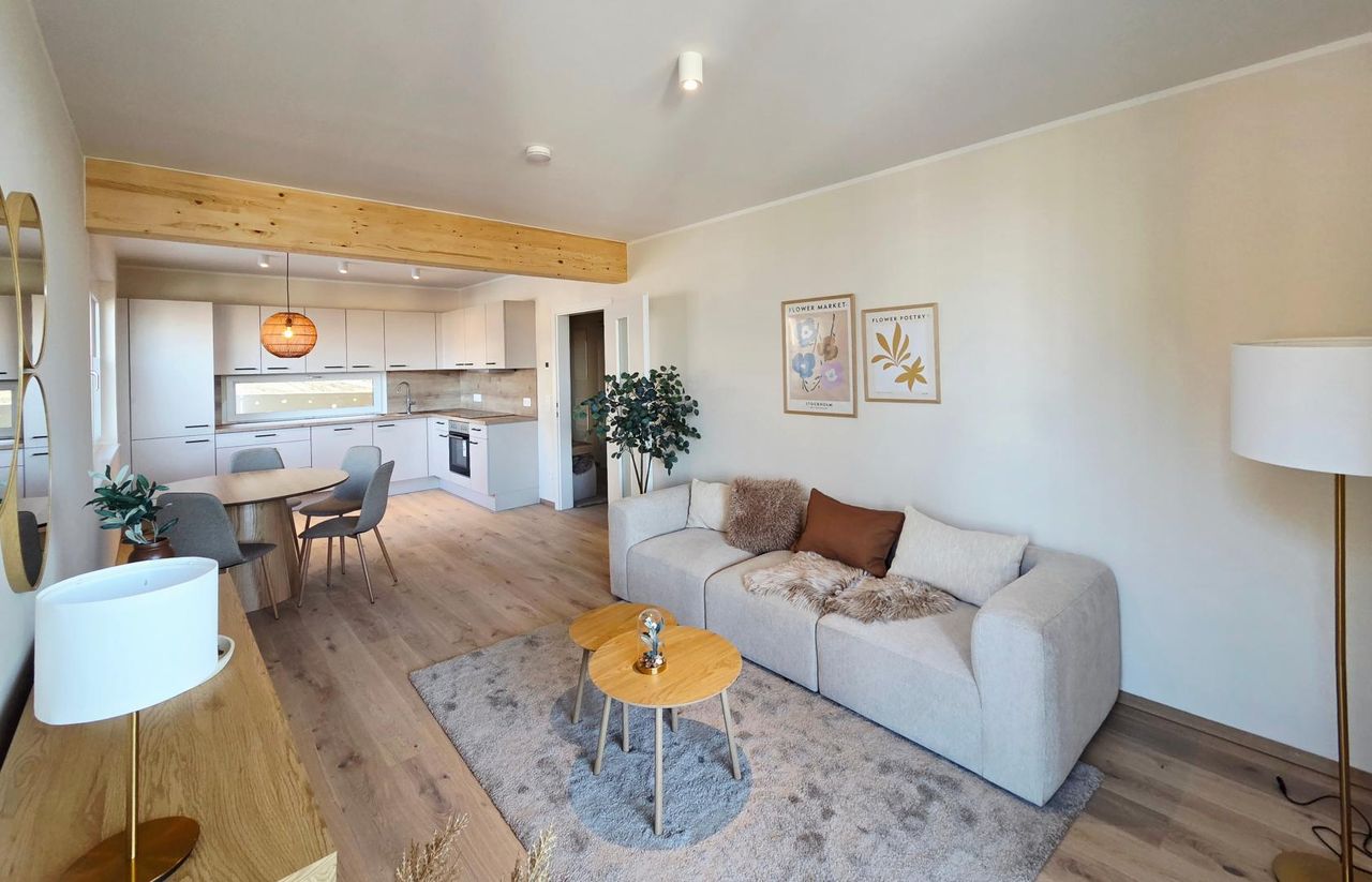 Die Wohnung bietet einen großzügigen Wohn-/Essbereich mit einer offenen Küche, zwei Schlafzimmer, einen Vorraum, ein Badezimmer, einen Abstellraum und ein WC.