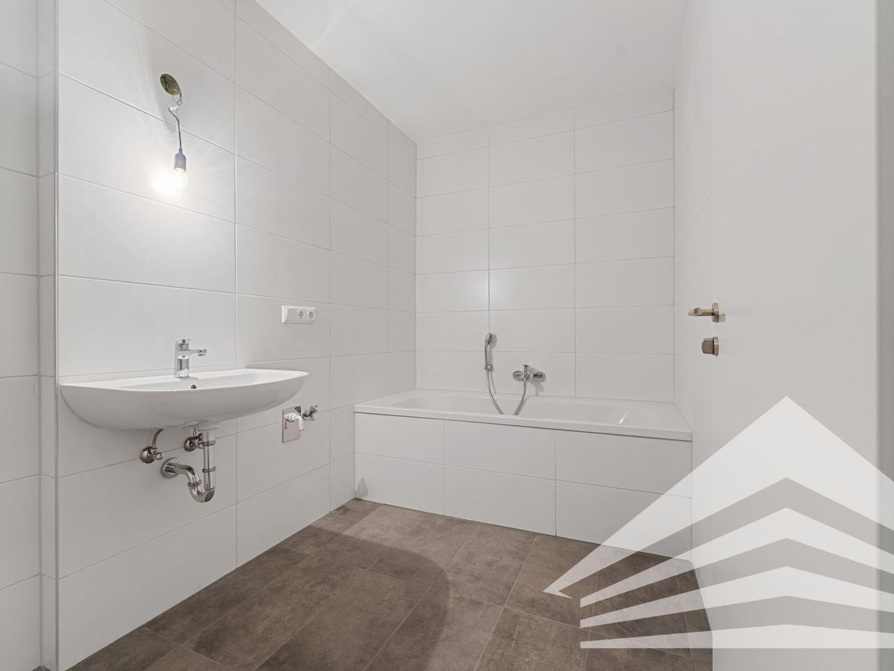 > Modernes Bad mit Dusche, Badewanne, Handwaschbecken, WM-Anschluss und WC