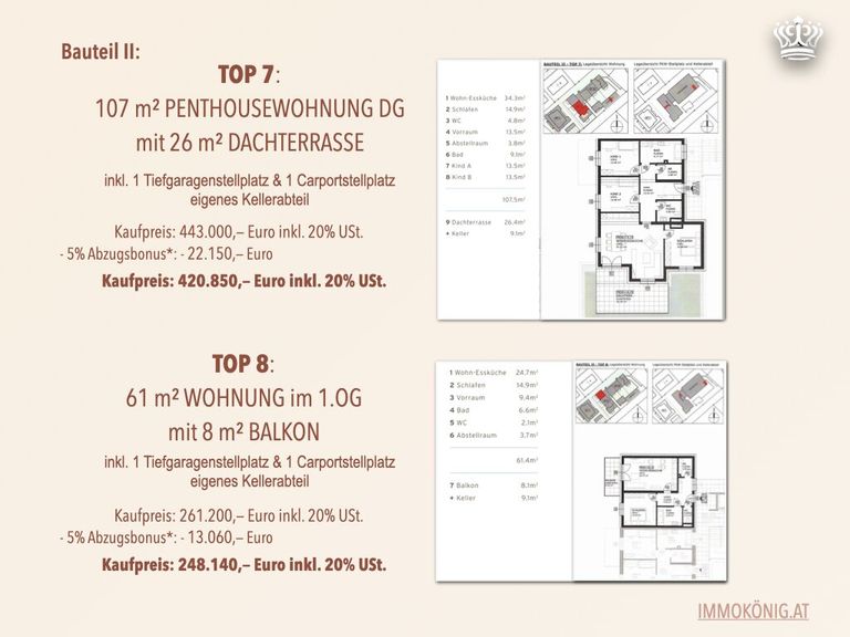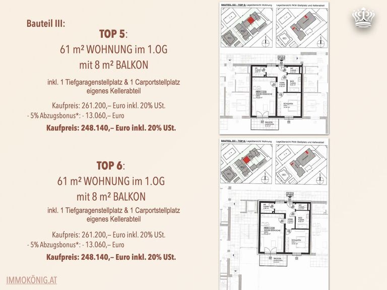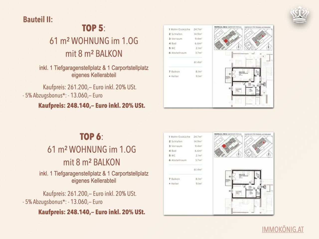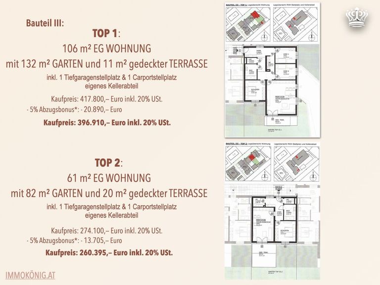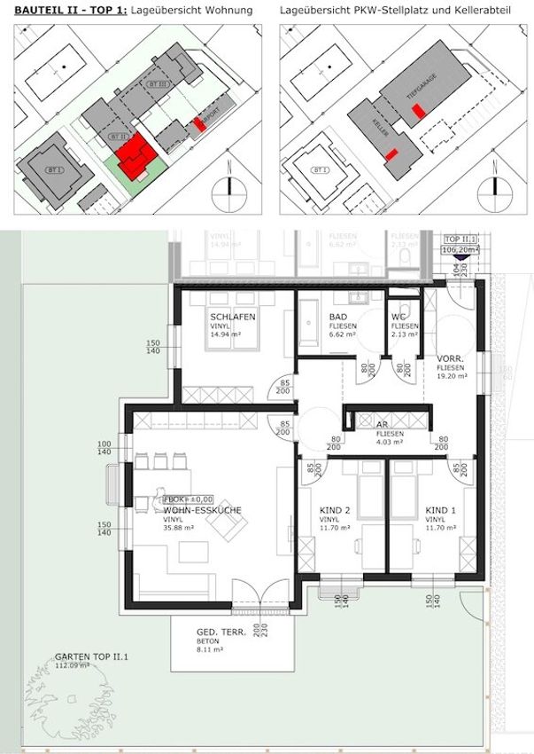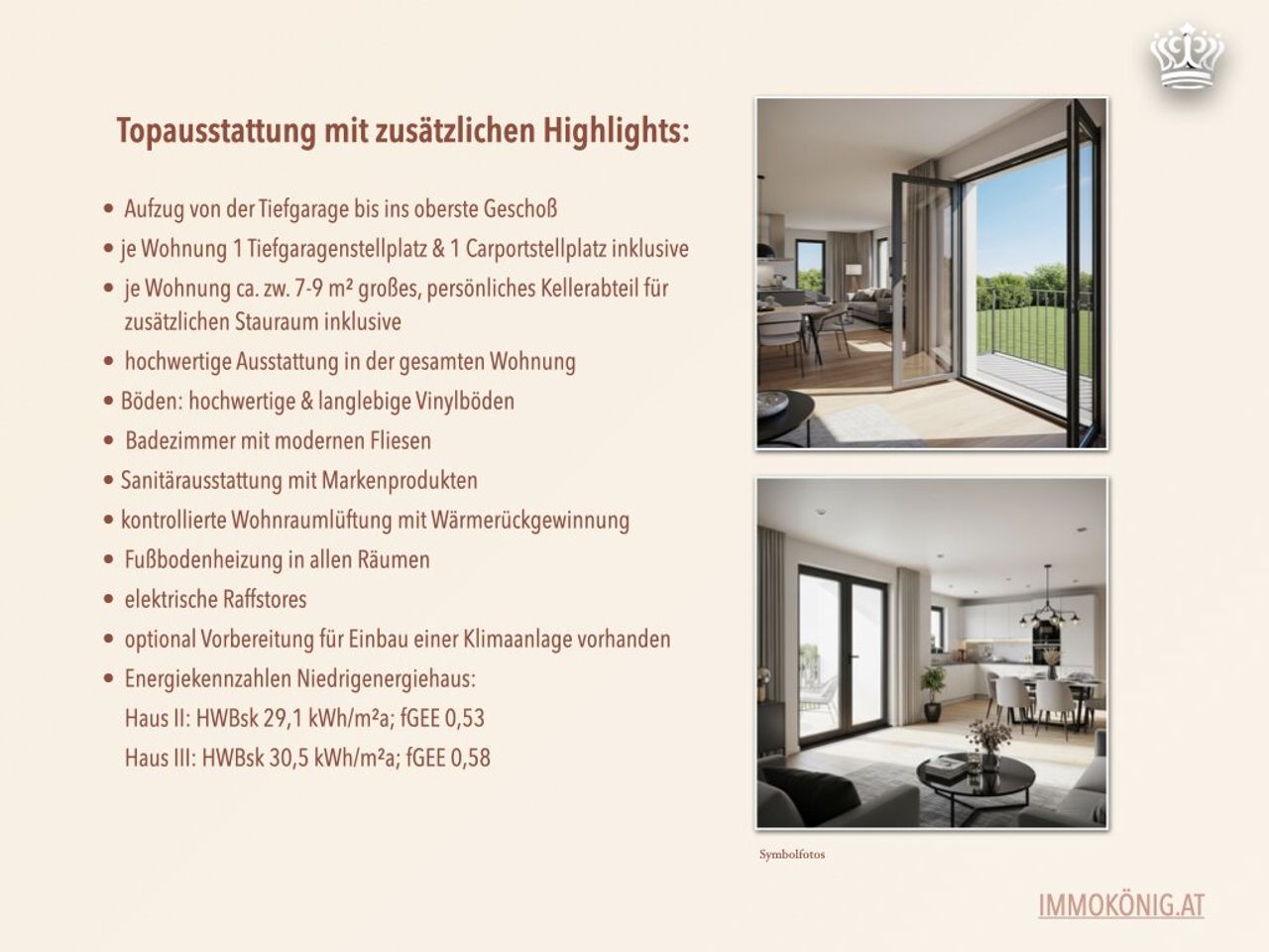 - inkludiert: 1 eigenes Kellerabteil, 1 Tiefgaragenstellplatz, 1 Carportstellplatz