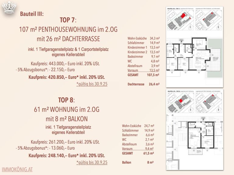 - Größen: ca. 61 m2 (1 Schlafzimmer) und ca. 107 m2 Wohnfläche (3 Schlafzimmer)