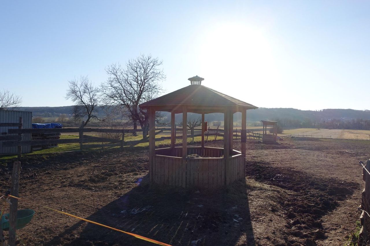 Auf einem weitläufigen Grundstück von über 7.000 m² finden Sie direkt neben dem Wohnhaus eine großzügige Pferdekoppel mit Unterstellplätzen und einem Roundpen. Drei Heuraufen sorgen dafür, dass Ihre Pferde stets gut versorgt sind. Die Tiere leben hier in einer natürlichen Umgebung – Boxen oder geschlossene Ställe sind nicht vorgesehen. Das Grundstück ist komplett eingezäunt, sodass Sie Ihre Pferde auch in den Hausbereich lassen können. Genießen Sie gemeinsame Momente im Garten oder beobachten Sie Ihre Tiere bequem vom Saloon aus!