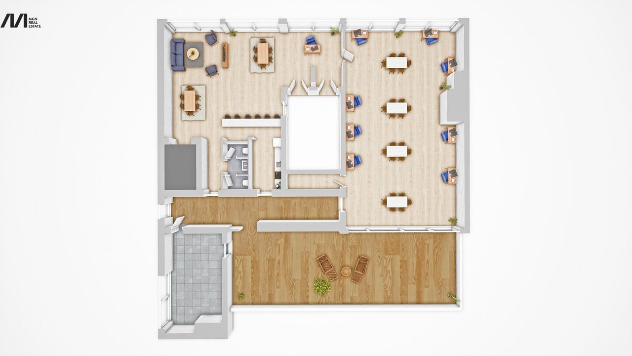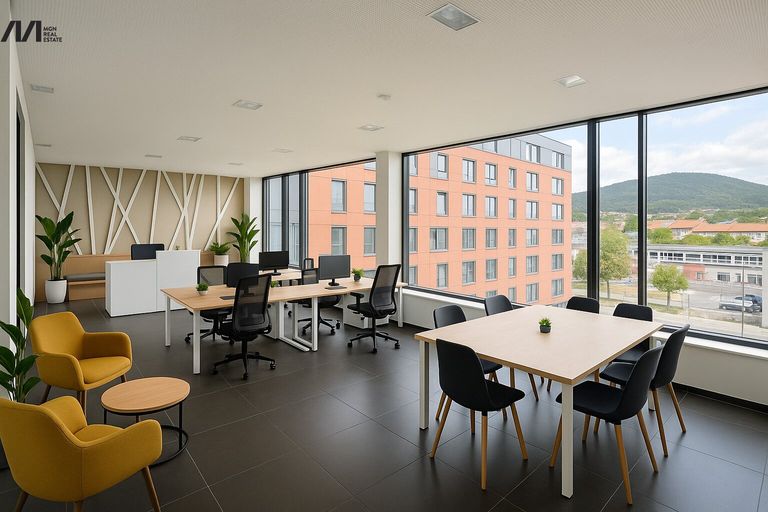 Die Raumaufteilung ist variabel und lässt sich exakt auf Ihre betrieblichen Anforderungen abstimmen. Ob klare Strukturen mit Einzelbüros und Besprechungsräumen oder offene Workspaces für agiles Arbeiten – hier haben Sie alle Freiheiten. Großzügige Fensterfronten durchfluten die Räume mit Tageslicht und sorgen für eine produktive, angenehme Atmosphäre. Eine integrierte Wohnraumlüftung unterstützt das Raumklima und schafft dauerhaft frische Luft für konzentriertes Arbeiten.