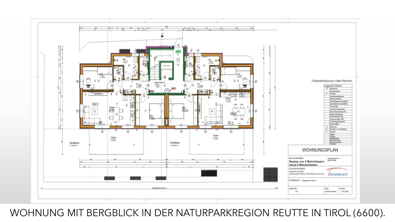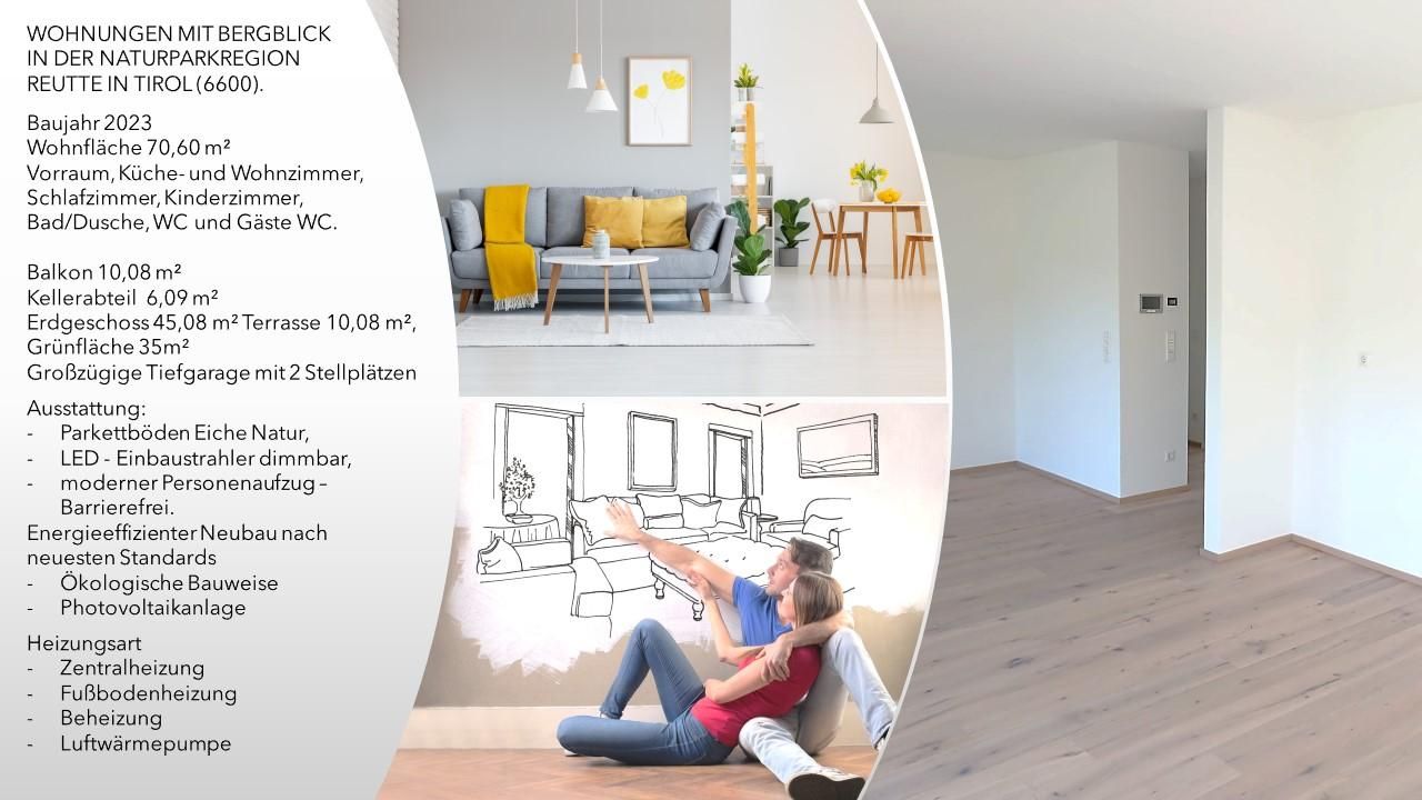 Für Anleger und Vermieter: Der Kaufpreis Gesamt von € 3.393.333,. ist netto zzgl. UST (€ 4.072.000,-) WOHNUNGEN MIT BERGBLICK IN DER NATURPARKREGION REUTTE IN TIROL (6600). Baujahr 2023, Wohnflächen der Wohnungen 8X 70,60 m² und 2X 90m2 Wohnfläche in Summe 748m2 + Terrassenflächen 168m2, Gärten 304m2, Balkone 44m2 Kellerabteile 80m2 + 20 Tiefgaragenplätze Raumaufteilung: Vorraum, Küche-und Wohnzimmer, Schlafzimmer, Kinderzimmer,Bad/Dusche, WC und Gäste WC., Balkon 10,08 m², Kellerabteil 6,09 m², Erdgeschoss 45,08 m² Terrasse 10,08 m², Grünfläche 35m² ,Großzügige Tiefgarage mit 2 Stellplätzen Energieeffizienter Neubau nach neuesten Standards. - Ökologische Bauweise - Photovoltaikanlage - Fußbodenheizung durch Luftwärmepumpe Ausstattung: * Parkettböden Eiche...
