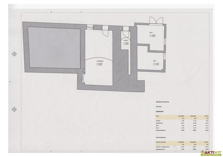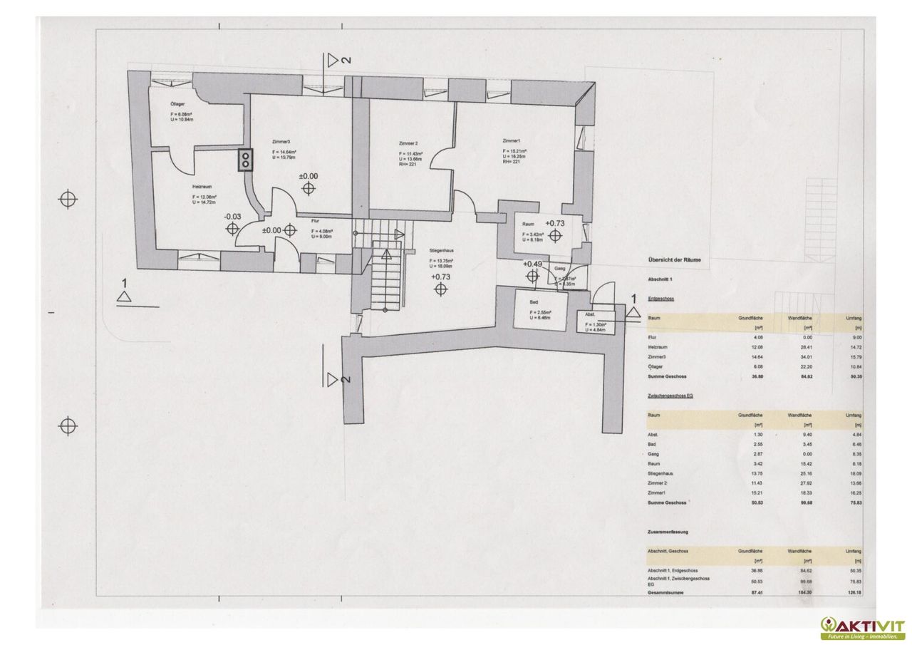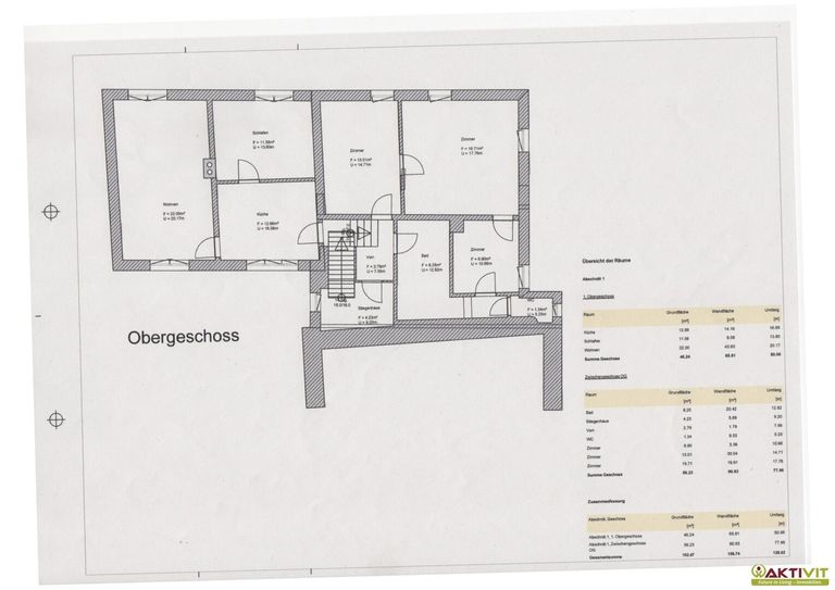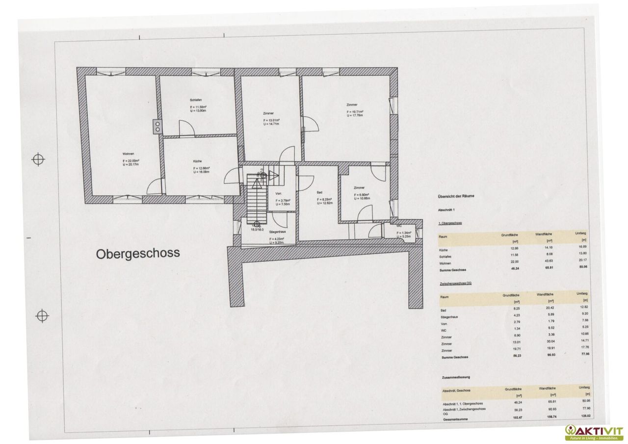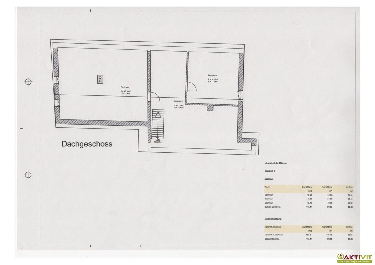 Das Haus erstreckt sich über vier Ebenen – Untergeschoss, Erdgeschoss, Obergeschoss und Rohdachboden – und bietet eine Gesamtfläche von ca. 360 m², wovon etwa 190 m² als Wohnfläche genutzt werden können. Die restliche Fläche verteilt sich auf den Keller (ca. 60 m²) und den ungenutzten Dachboden (ca. 110 m²), der viel Raum für Ausbaupläne bietet.