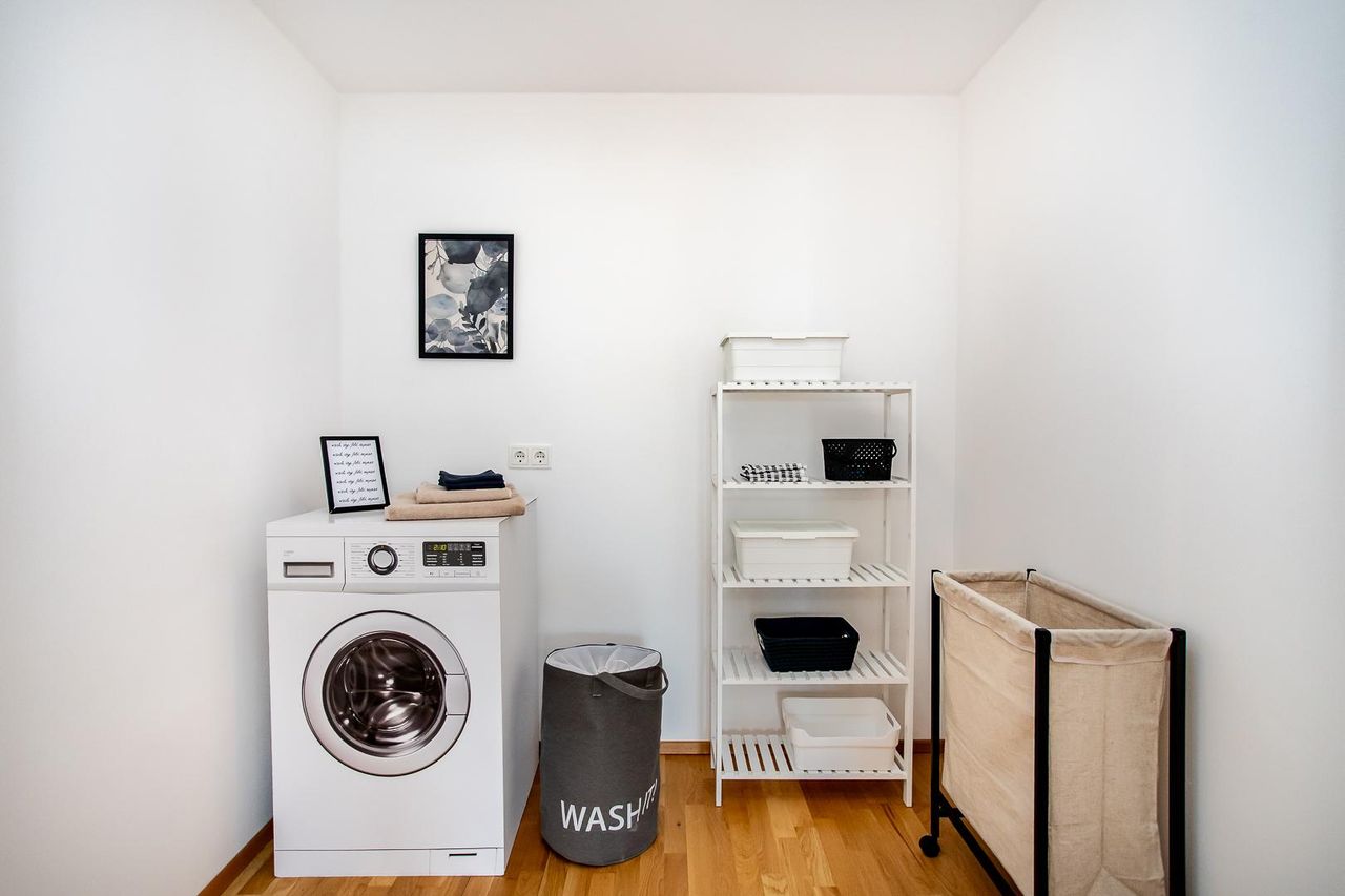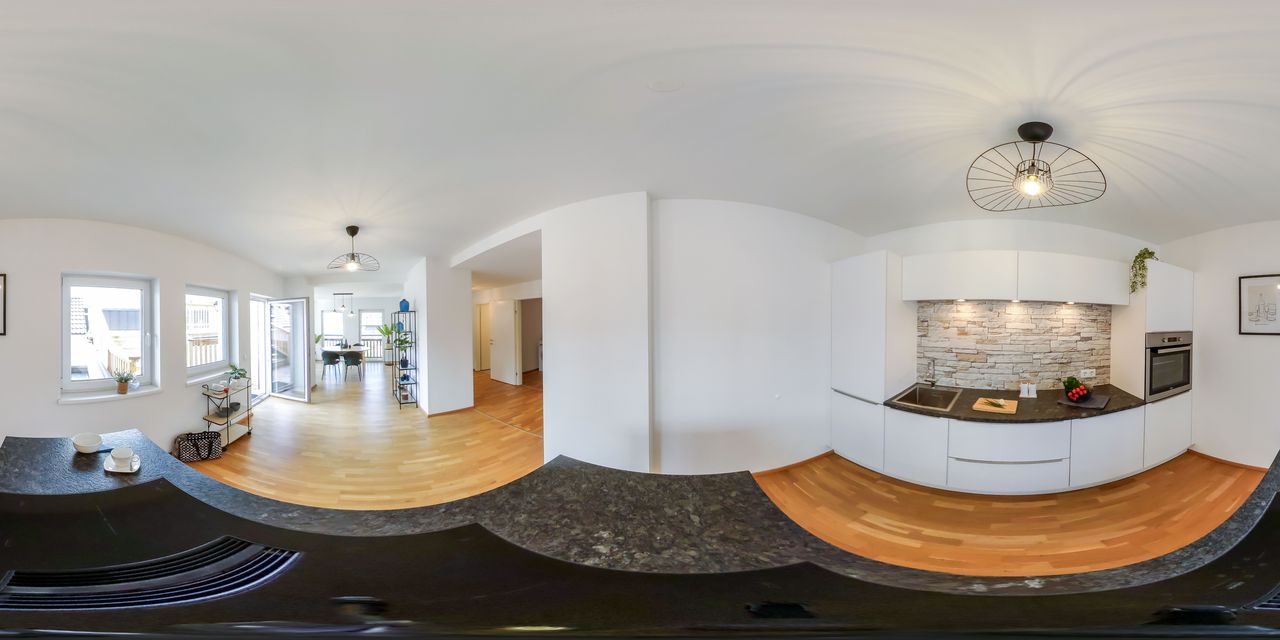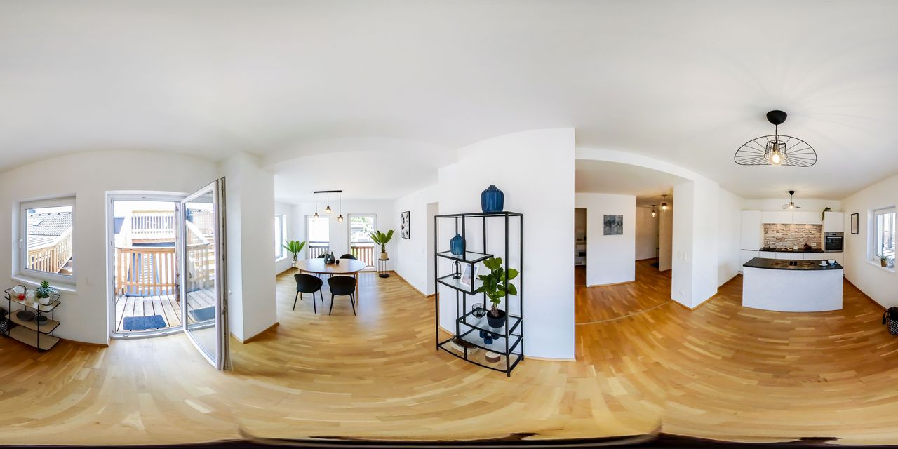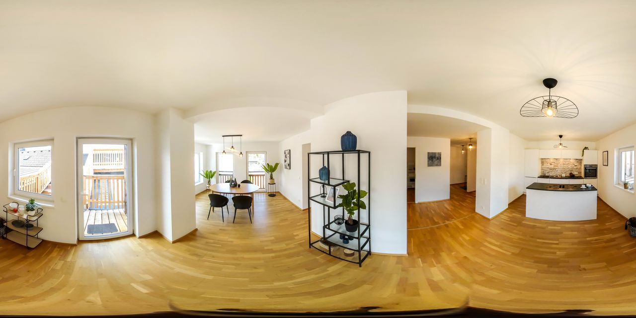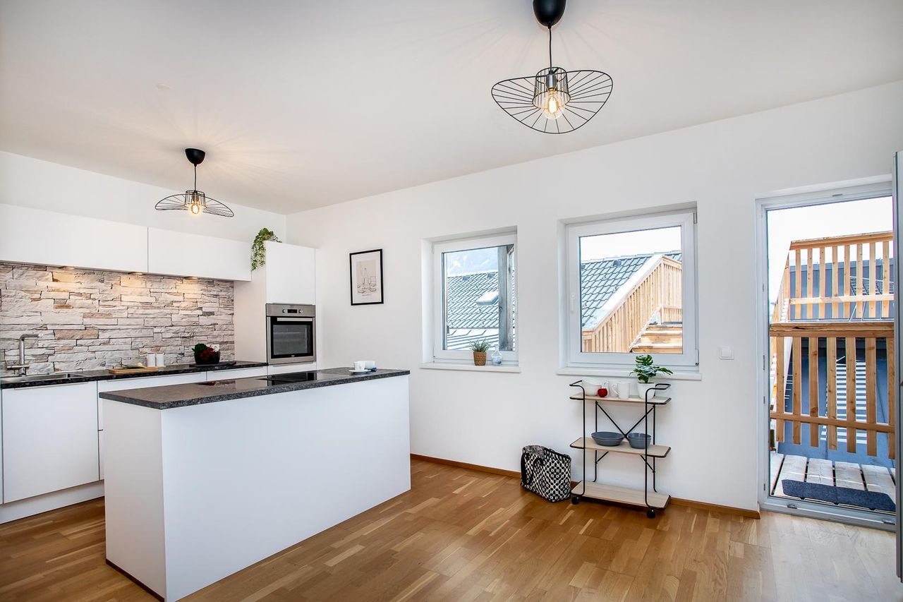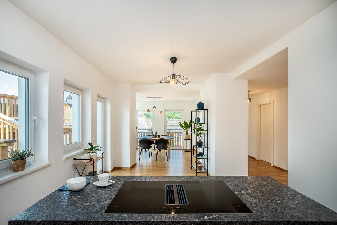 Der offene Wohn-, Koch- und Essbereich bildet das Herzstück der Wohnung: Eine moderne Küche mit hochwertigen Geräten geht fließend in den Essplatz über, der viel Raum für geselliges Beisammensein bietet. Das angrenzende Wohnzimmer lädt mit seinem behaglichen Ambiente und Zugang zu einem weiteren Balkon zum Verweilen ein. Ein praktischer Abstellraum mit Waschmaschinenanschluss ergänzt das Raumangebot funktional.