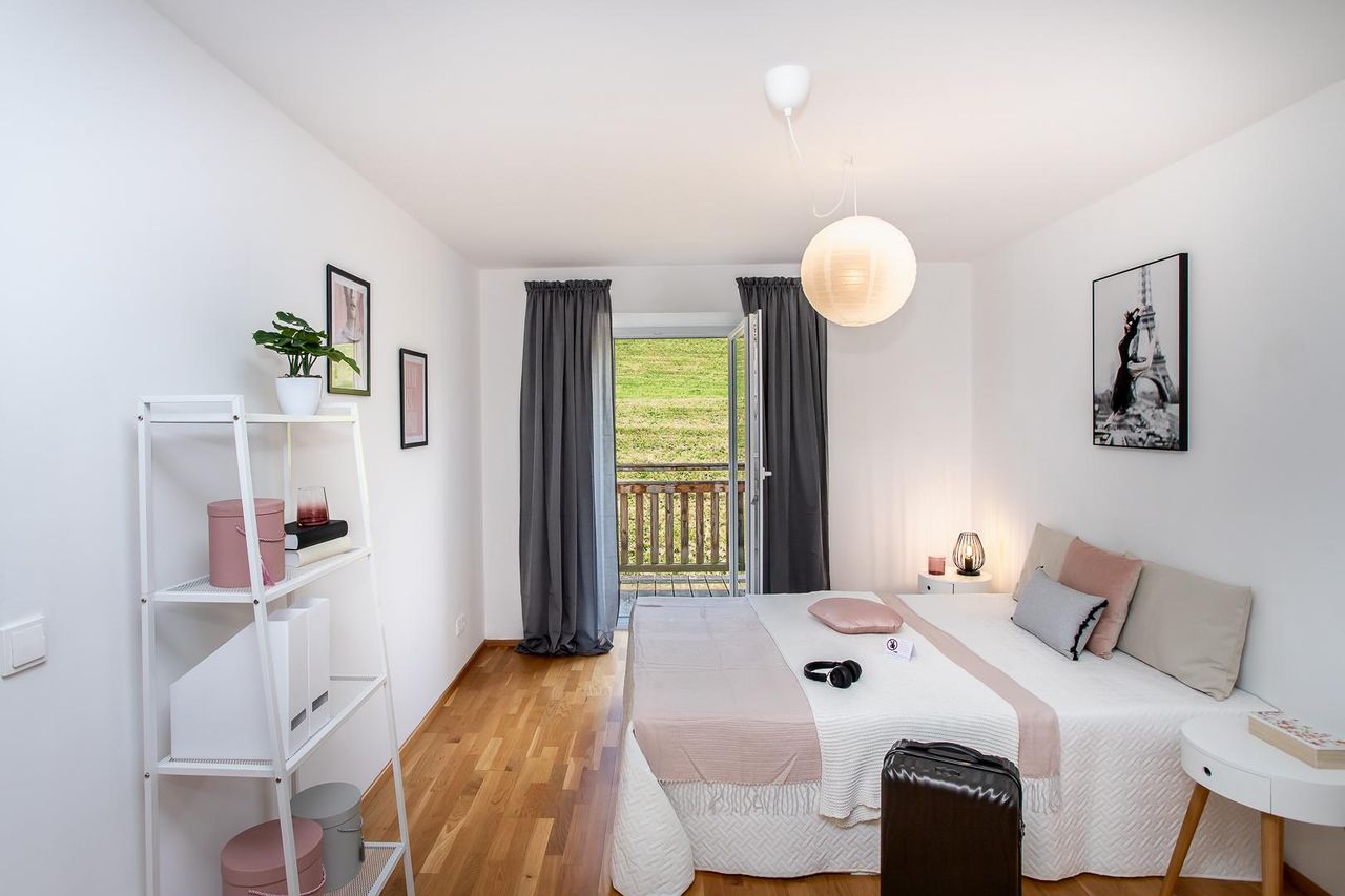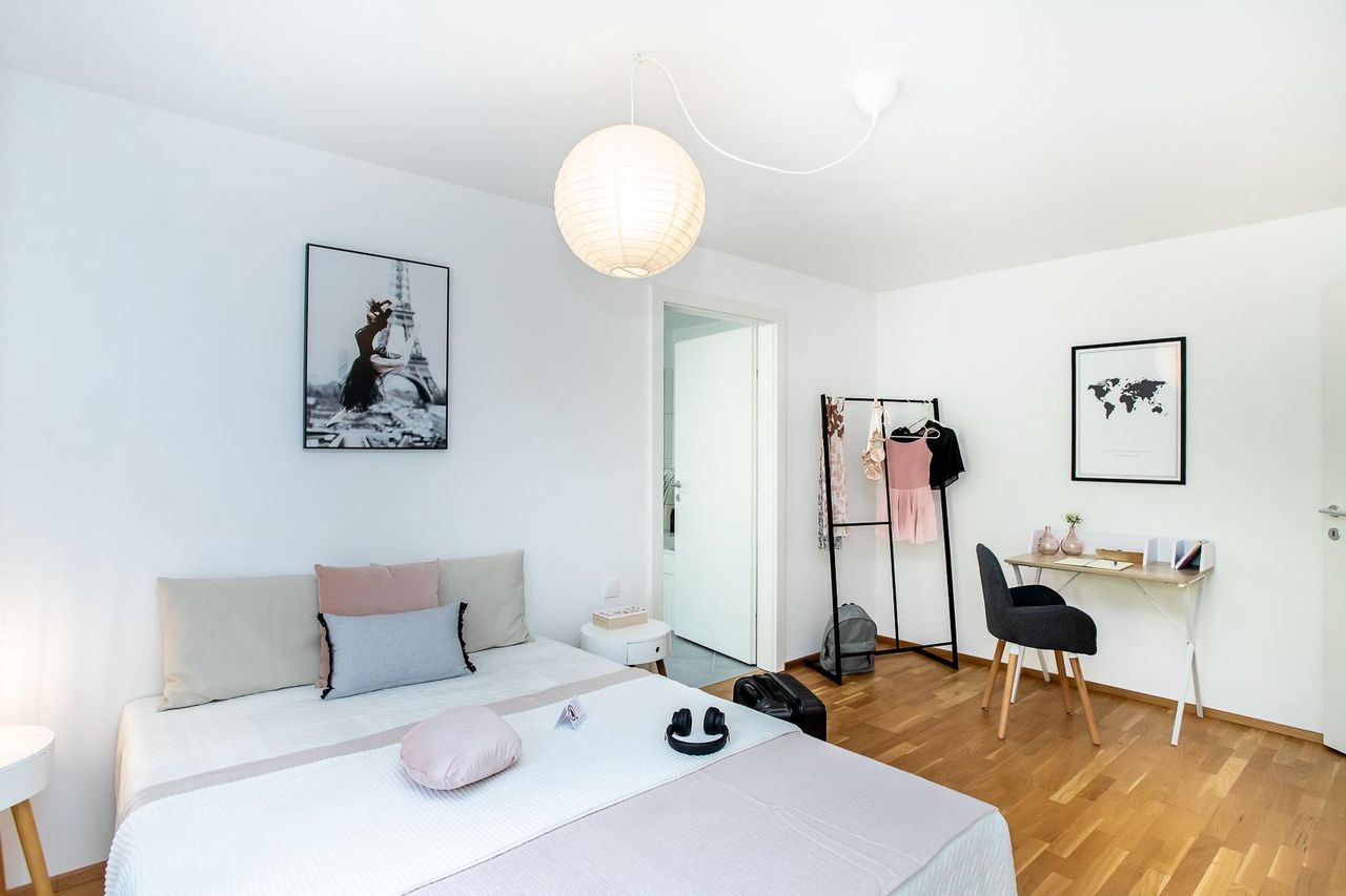 Zwei komfortable Schlafzimmer mit direktem Zugang zum Balkon ermöglichen maximale Privatsphäre – jedes davon verfügt über ein eigenes, stilvoll ausgestattetes Badezimmer. Eines der Bäder ist mit WC ausgestattet, ein separates Gäste-WC sorgt für zusätzlichen Komfort.