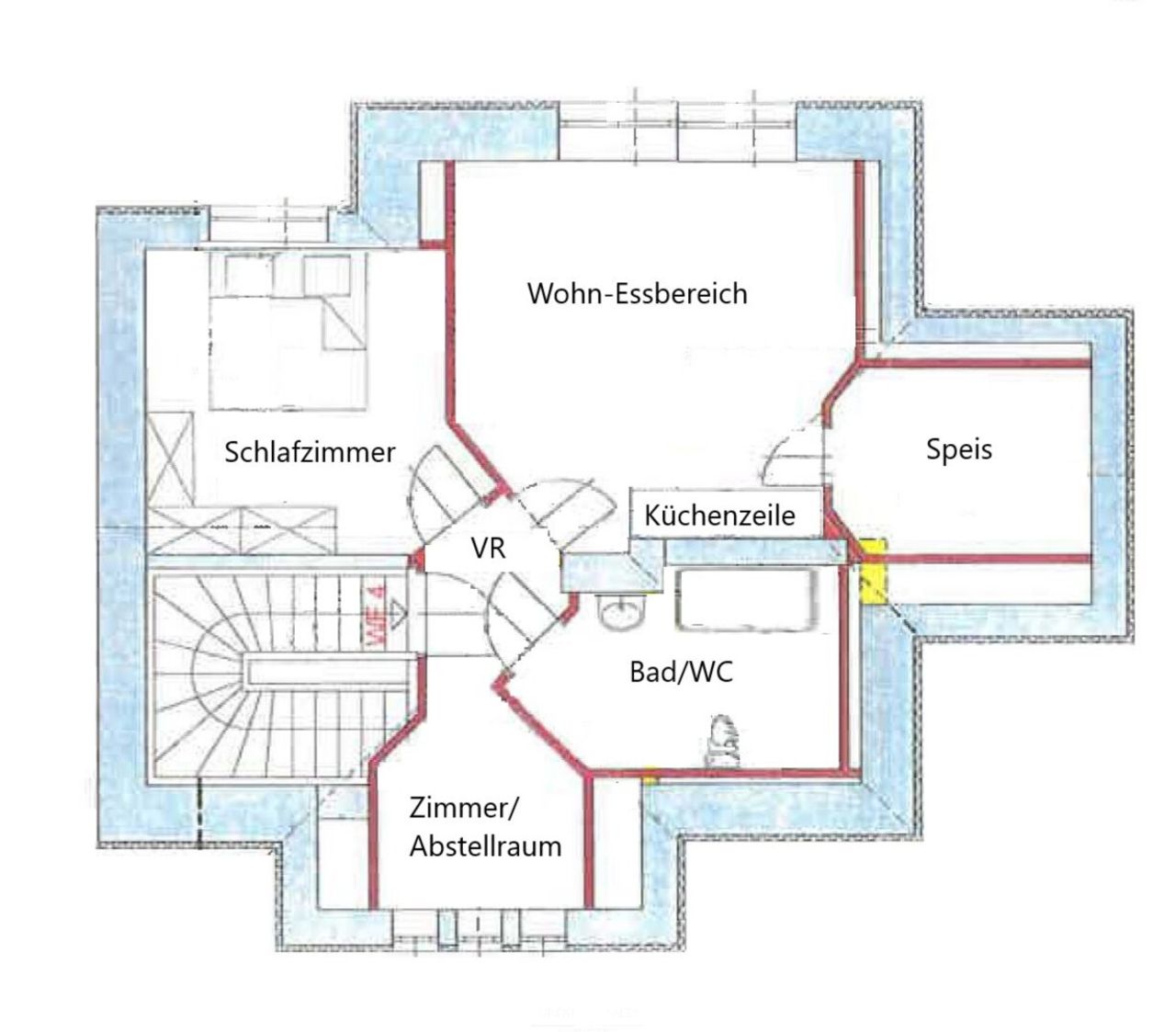 - Vorraum - Wohn/-Essbereich mit einer gut ausgestatteten Küchenzeile und E-Geräten - Abstellraum/Speis - einem Bad mit Waschbecken, Badewanne, WC, Waschmaschinenanschluss und Dachfenster - Schlafzimmer - begehbares Kleiderschrankzimmer