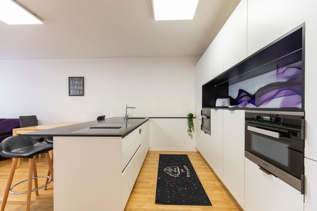 Die Wohnung ist vollmöbliert und mit hochwertigen Materialien ausgestattet.