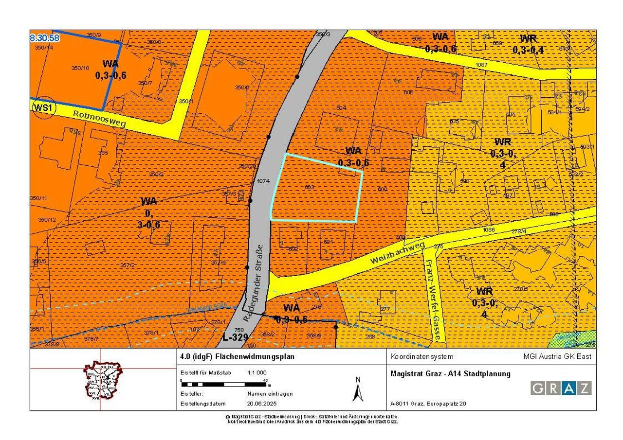 Das sonnige Grundstück mit ca. 1.120 m² Fläche ist gut nach Südwesten ausgerichtet und erlaubt aufgrund der Widmung und der Bebauungsdichte (WA 0,3-0,6) grundsätzlich eine großvolumige Bebauung.