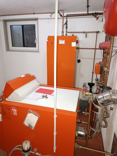 Für angenehme Wärme sorgen eine Ölheizung sowie eine Fußbodenheizung im gesamten Haus. An kalten Tagen können Sie es sich vor dem Kamin im Wohnbereich gemütlich machen und die wohlige Atmosphäre genießen. Dank der großen Fensterfront haben Sie gute Sicht auf die Terrasse und Garten.