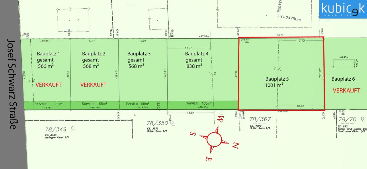 Das attraktive Baugrundstück Nr. 5 erstreckt sich über eine Fläche von ca. 1.001 m², und grenzt an das Areal des örtlichen Kindergartens, der eventuell für eine lebhafte Atmosphäre (Wochentags bis 17 Uhr) sorgt. Der Garten ist aber in idyllischer und ruhigen Umgebung Richtung Josef Schwarz Straße ausgerichtet.