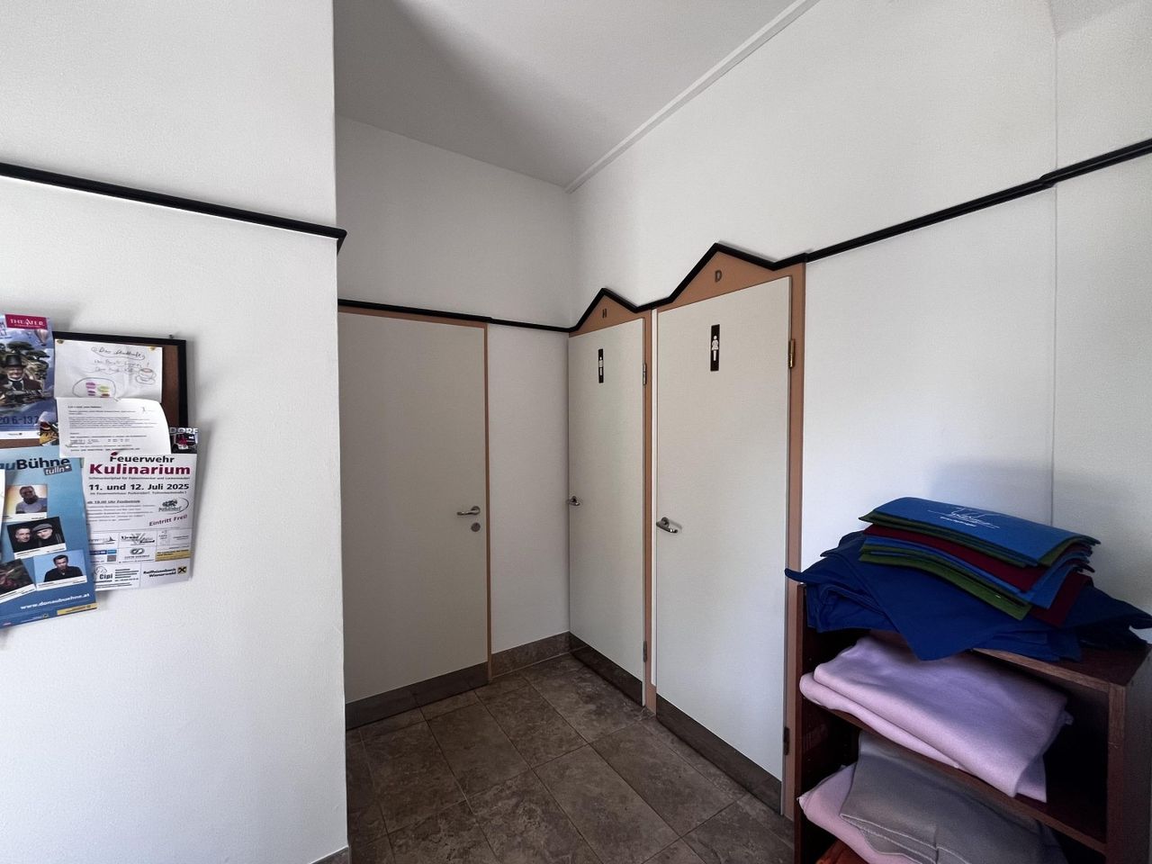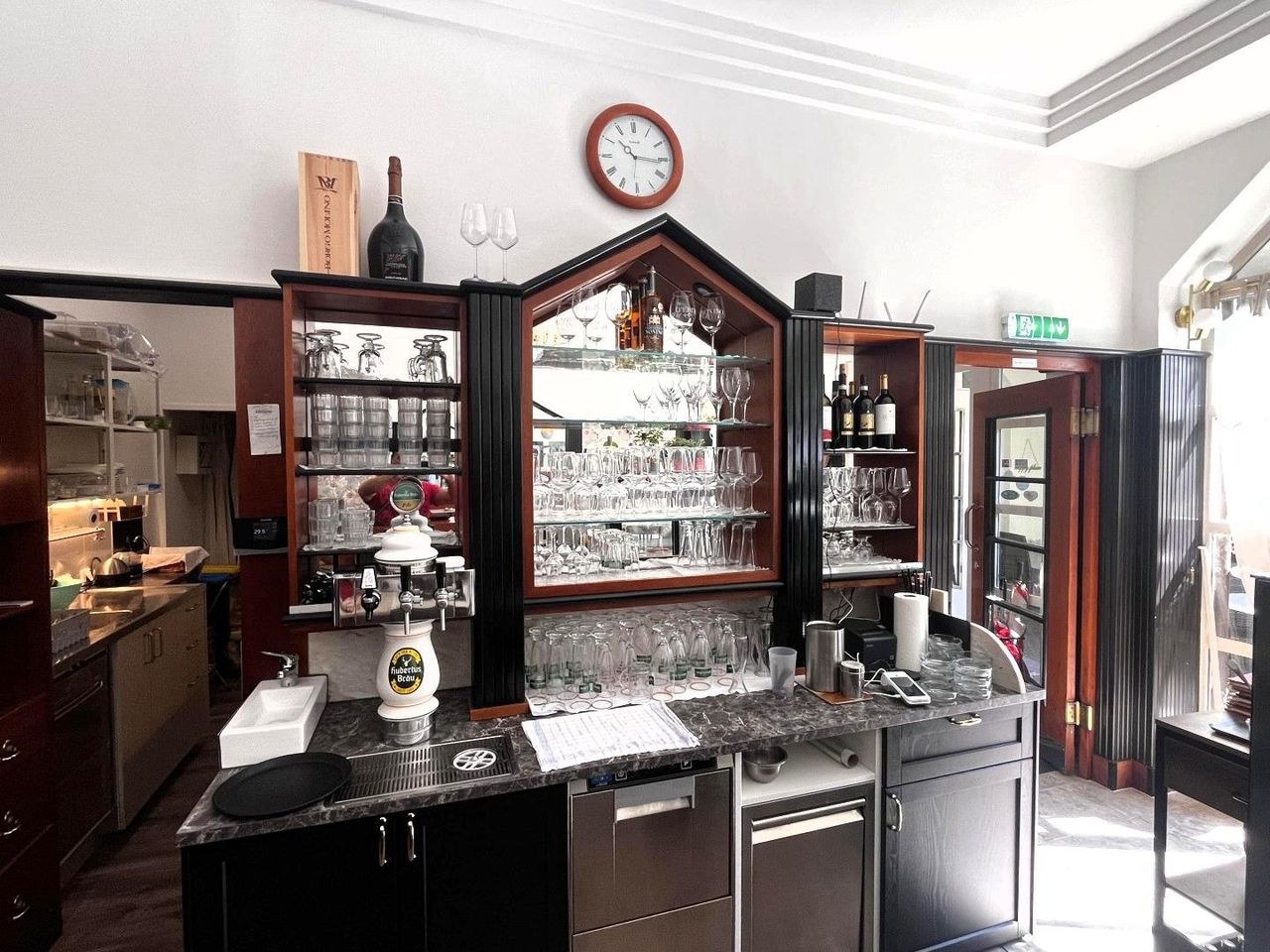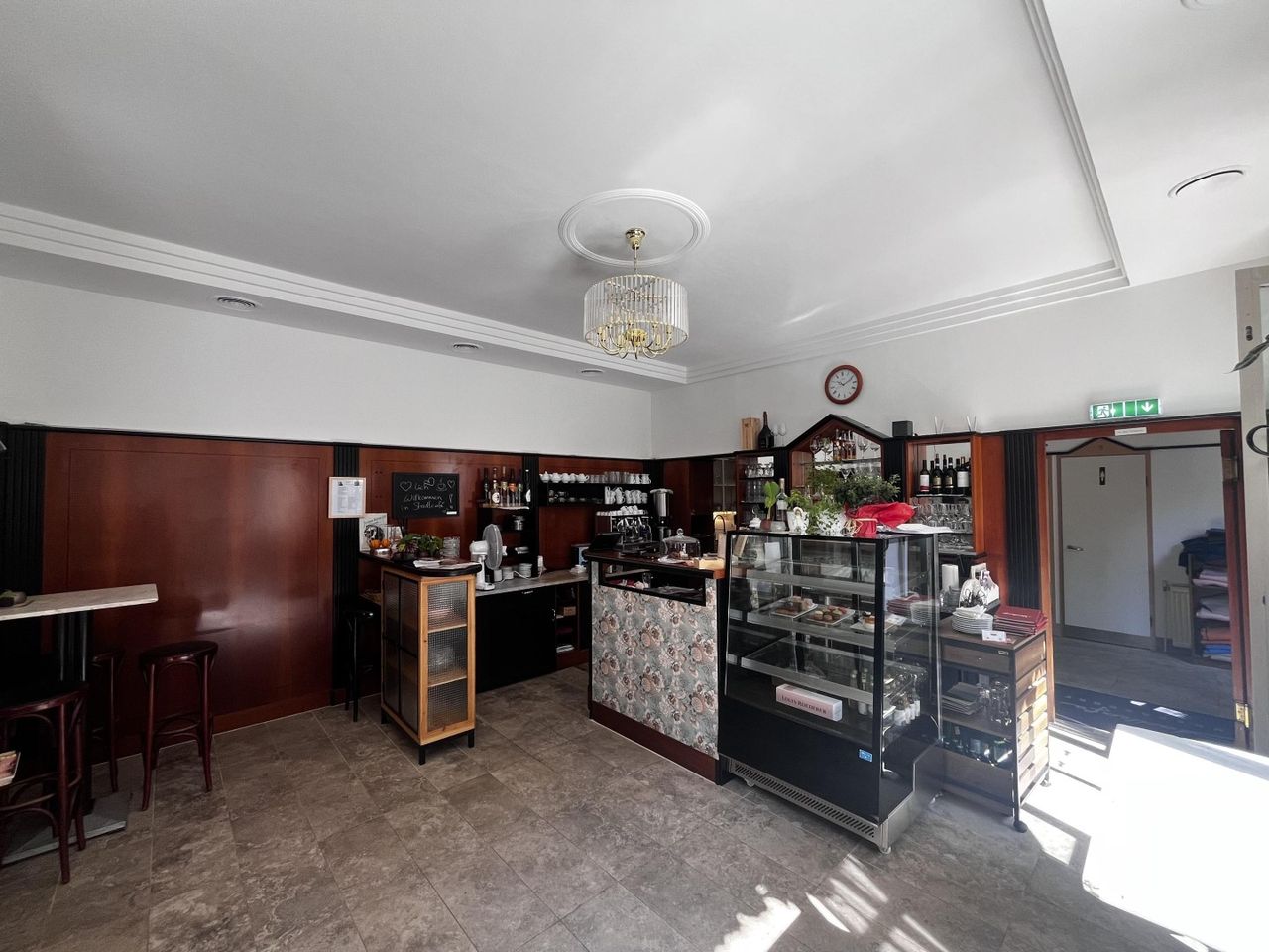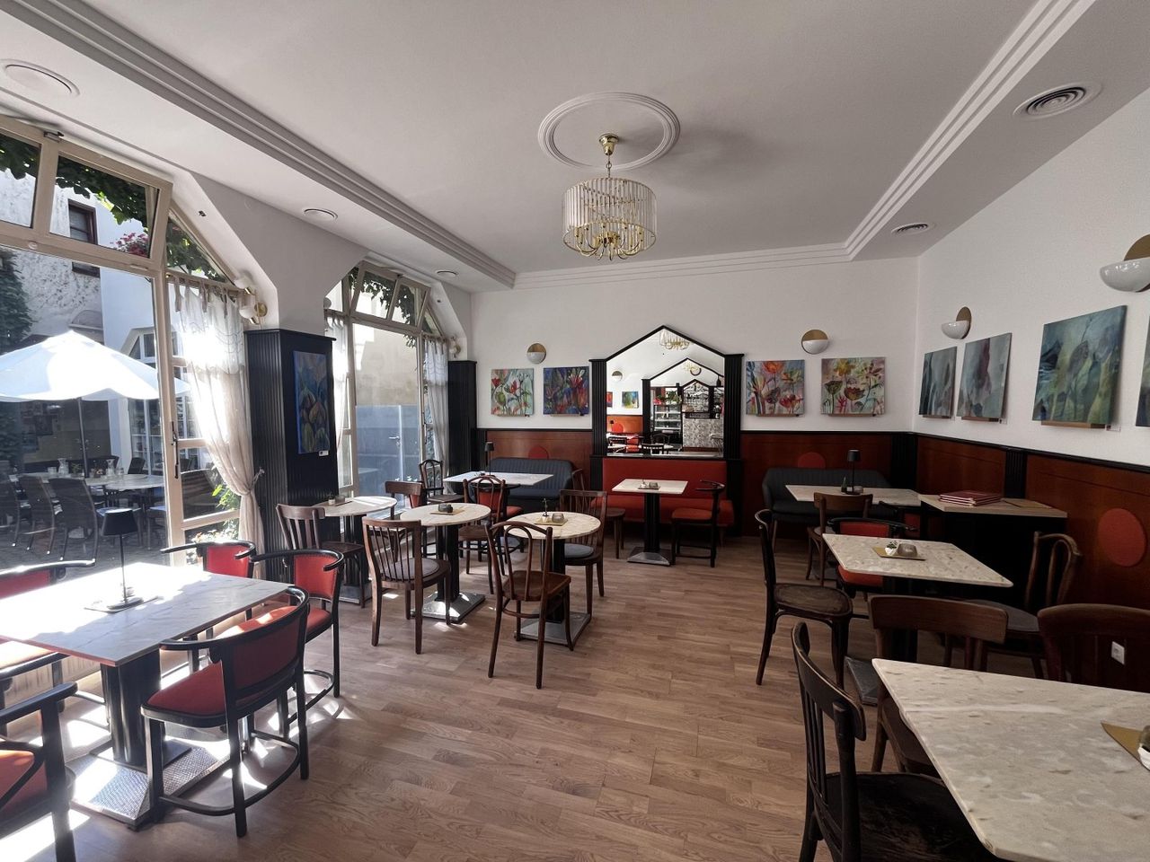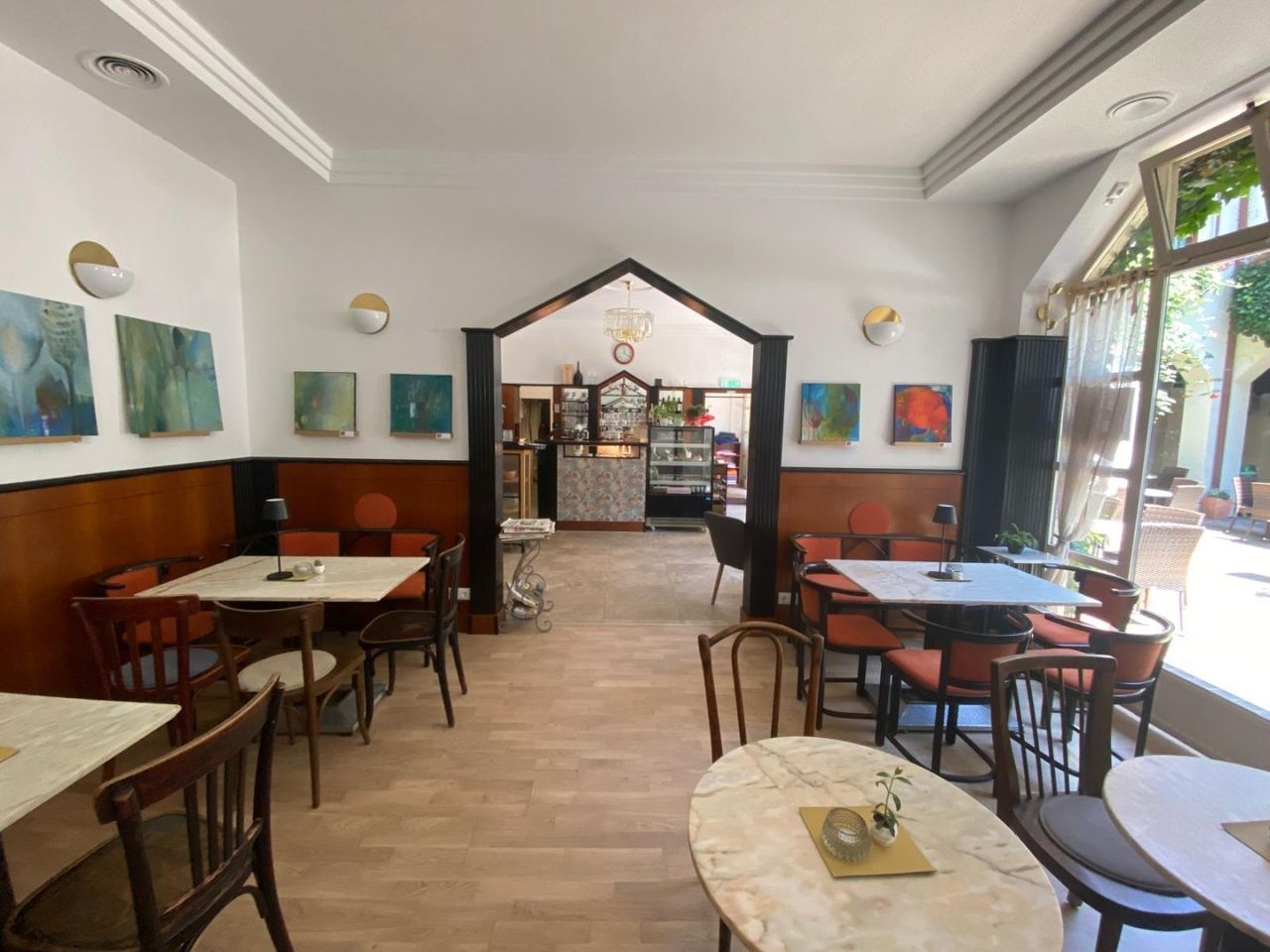 Im Innenbereich wurde die Täfelung zeitgemäß nach unten versetzt, um Künstlern aus der Region die Möglichkeit zu geben Ihre Bilder zu präsentieren. Die Möbel sind von Thonet, sämtliche Sitzbänke wurden neu und passend tapeziert.