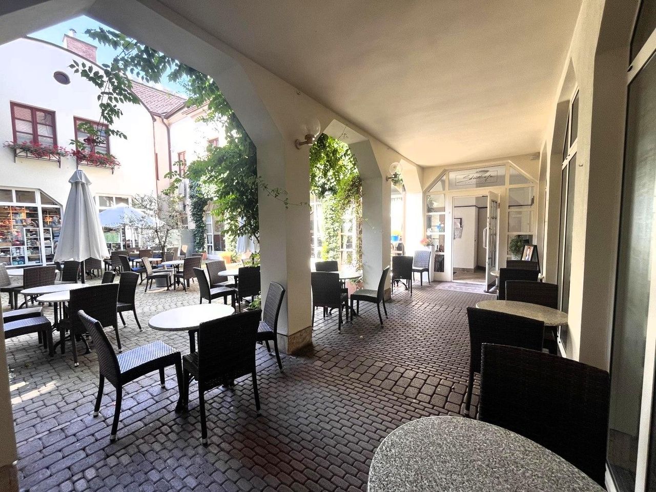Komplett neugestaltet und mit vielen Möglichkeiten ausgestattet präsentiert sich diese Gastronomie im geschützten Innenhof der Passage, welche ausschließlich mit gewerblich betriebenen Geschäftslokalen und Arztpraxen auch bei nächtlichem Betrieb oder Veranstaltungen keine Lärmbelästigung darstellt.
