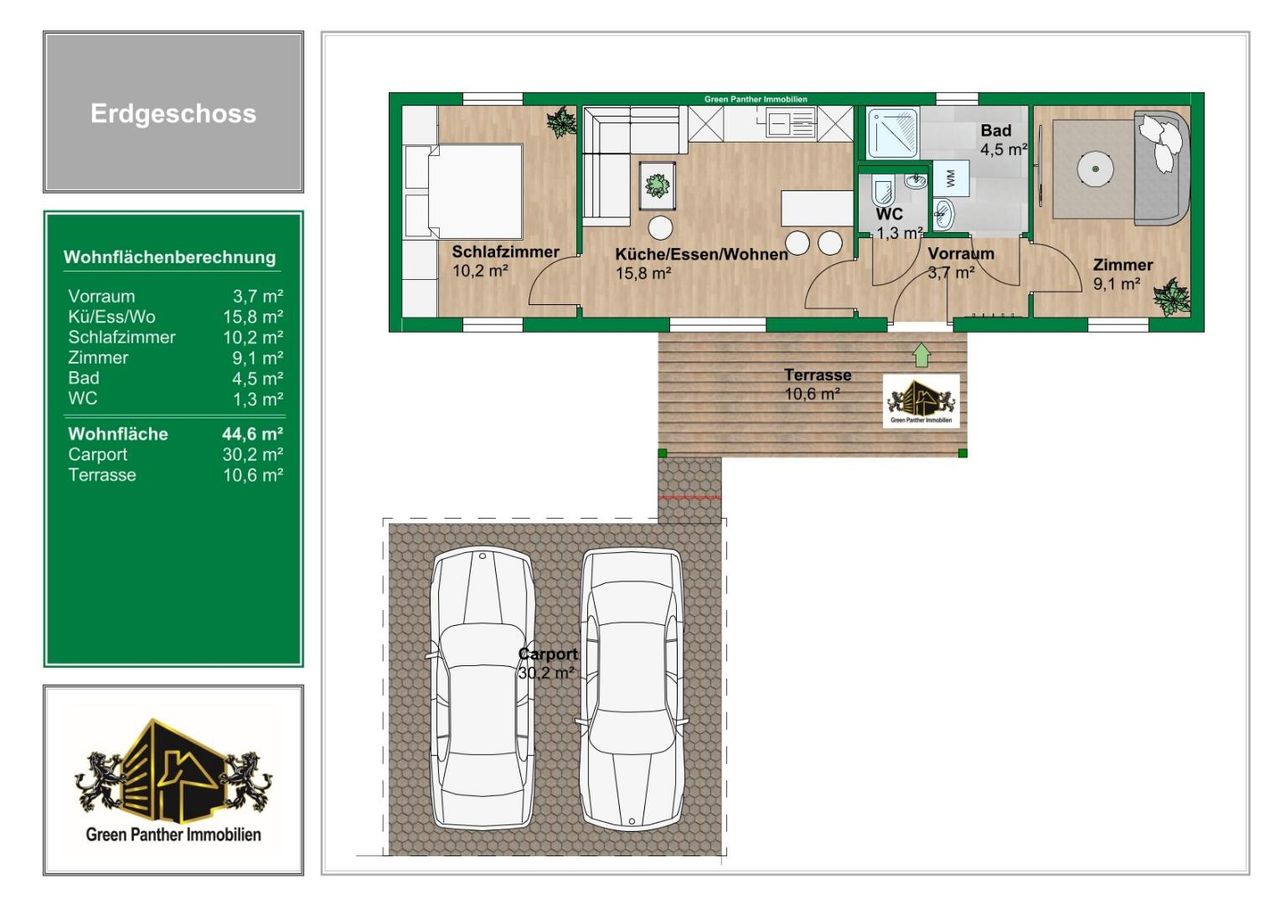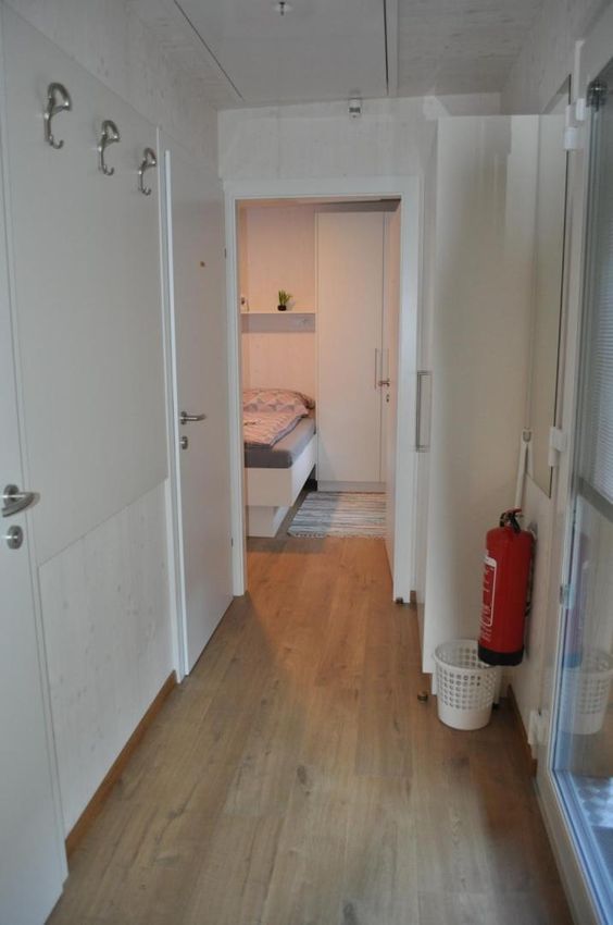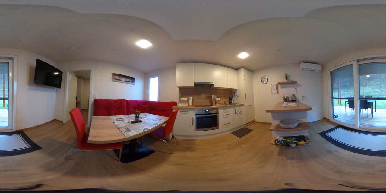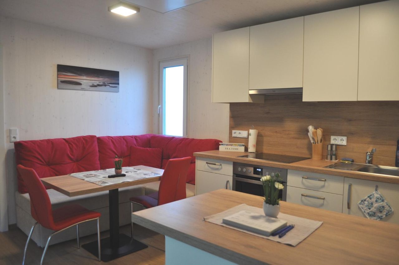 Das aus Massivholz gebaute Tiny-Haus ist voll möbliert und verfügt über eine Infrarotheizung, Warmwasserbereitung, SAT-TV, Glasfaser Internet-Anschluss, eine voll ausgestattete Küche mit Geräten und ein Badezimmer mit einer Waschmaschine.
