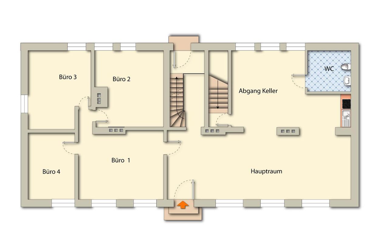 Der Haupteingang zum Geschäft ist zentral über eine Eingangsrampe barrierefrei erreichbar. Hier gelangen Sie in den großen halboffenen Empfangs-/Hauptraum mit einem größerem behindertengerechten WC. Anschlüsse für eine kleine Teeküche sind ebenso vorhanden. Weiteres sind über das Nebenbüro drei weitere Büroräume nutzbar. Alle Räume sind mit hochwertigen Böden ausgestattet.