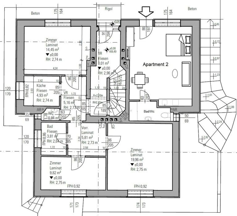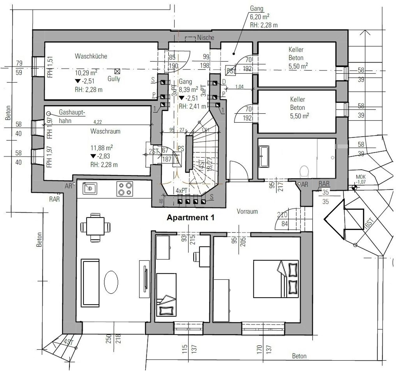 Raumaufteilung: Vorzimmer, Wohnzimmer mit Küche, Schlafzimmer, Kinderzimmer, Bad mit Dusche und WC, 12 m² Kellerraum (verfliest mit Waschmaschinenanschluss)