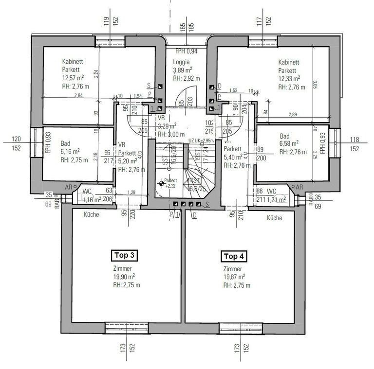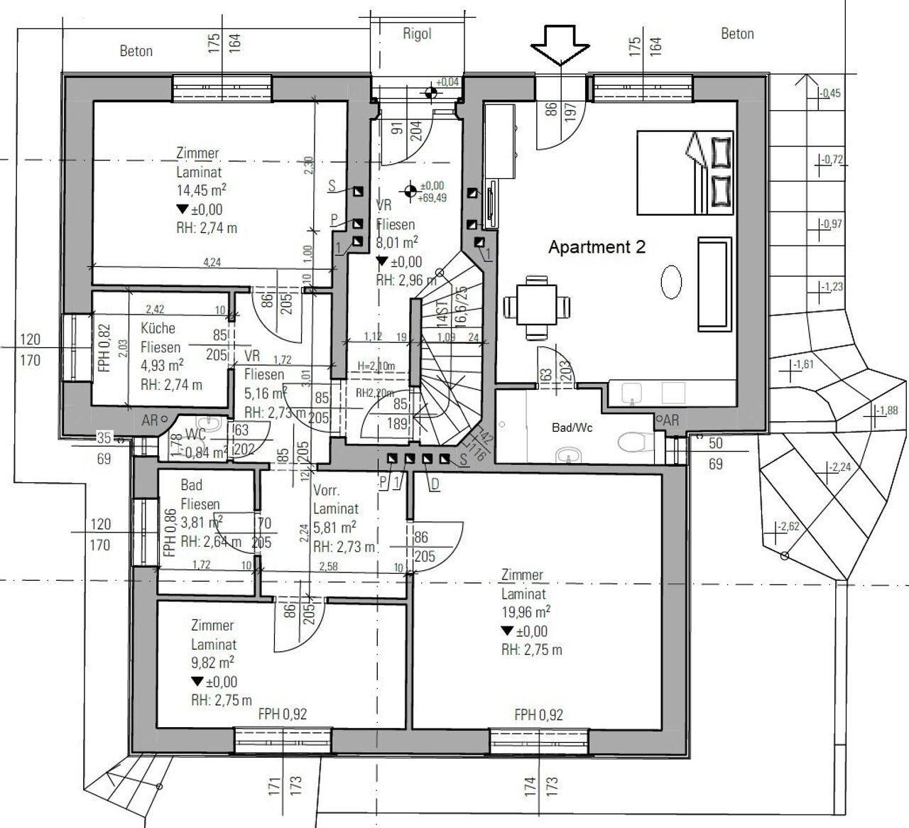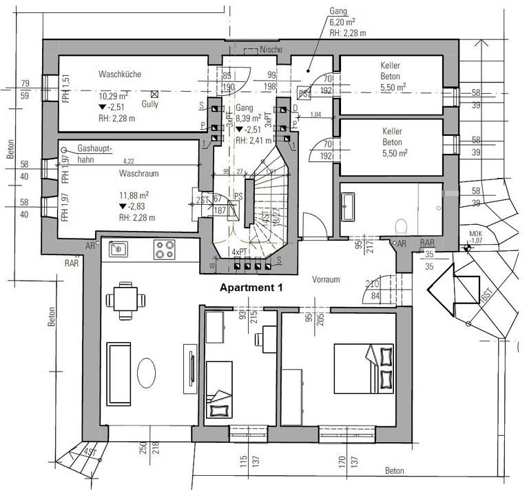 Raumaufteilung: Vorzimmer, 3 Zimmer, Küche, Badezimmer, WC, Kellerabteil; - Heizung Gasetagenheizung.