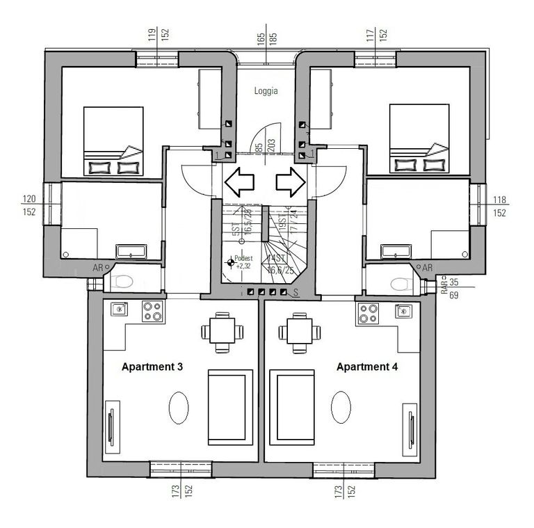 Im Haus befindet sich ein gewidmetes Apartment und 5 Wohneinheiten, wobei zwei Wohnungen der Kategorie A und C unbefristet vermietet sind.