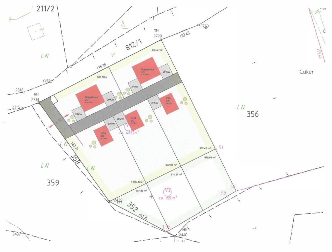 Das Gesamtgrundstück liegt in der Weststeiermark, ist sonnig und leicht geneigt und wurde durch einen Bebauungsvorschlag in 5 Parzellen geteilt, es befindet sich lt. FLWI im ausgewiesen Bereich WA-13 "Kumpusch-St.Josef" mit einer Dichte von 0,2-0,5. Im nördlichen Teil des Grundstückes befinden sich zwei Parzellen für die die Errichtung von 2 Doppelwohnhäusern, im südlichen Teil sind 3 Bauparzellen für Einfamilienwohnhäuser angeordnet. Im Anschluss von den 3 Einfamilienwohnhausparzellen befindet sich eine Parzelle gewidmet als Freiland mit einem Gesamtausmaß von ca. 1551 m2 welche in 3 Einzelparzellen (357,23 / 610,27 / 579,50m2) geteilt werden kann. Die Erschließung erfolgt über eine gemeinsame Zufahrtsstraße welche der Grundkäufer mit einem Anteil miterwirbt. Die Aufschließungskosten übernimmt der Verkäufer! Der begefügte Bebauungsvorentwurf kann sich möglicherweise ein wenig ändern. (Lt. endgültigem Bescheid Land Steiermark)