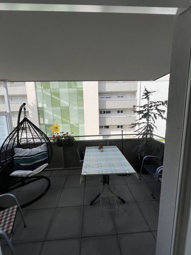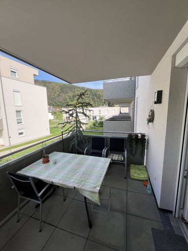 Der Balkon ist der ideale Ort, um die Sonne zu genießen und den Tag ausklingen zu lassen. Hier können Sie sich entspannen und den Blick auf die umliegende Landschaft genießen. Die Fußbodenheizung sorgt auch an kälteren Tagen für wohlige Wärme und schafft eine behagliche Atmosphäre.