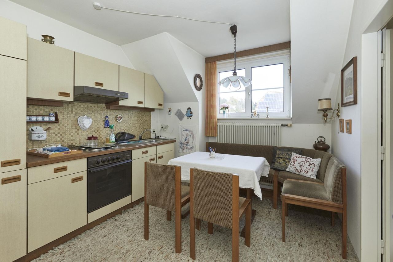 Der klassische Grundriss bietet Potenzial zur individuellen Gestaltung. Generell sind die einzelnen Räume lichtdurchflutet und hell. Im Obergeschoss sorgt die Dachschräge für eine gemütliche Atmosphäre und durch eine weitere Küche und ein weiteres Badezimmer ist hier eine separate kleine Wohneinheit vorhanden.