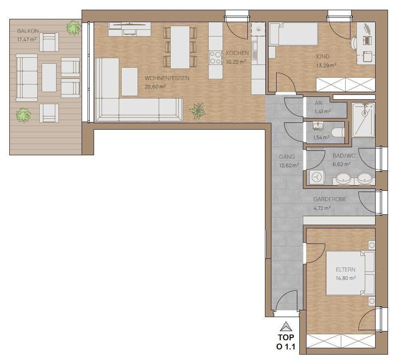 Die hier angebotene WOHNUNG O 1.1 (Haus OST, 1.OG, Top 1) bietet eine Wohnfläche von ca.85,54m², dazu einen Balkon/Terrasse mit ca.17,47m², sowie zusätzlich ein Kellerabteil.