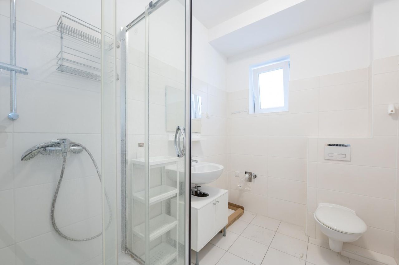Das großzügige Badezimmer verfügt über eine Dusche, ein WC, einen Anschluss für die Waschmaschine und ein Fenster für natürliches Tageslicht.