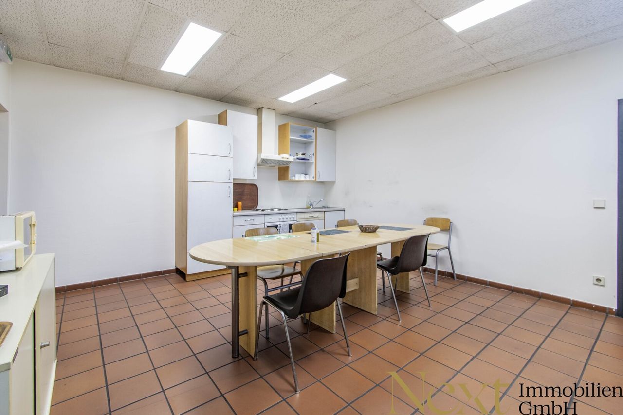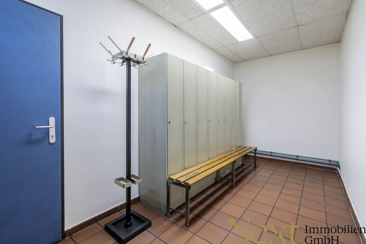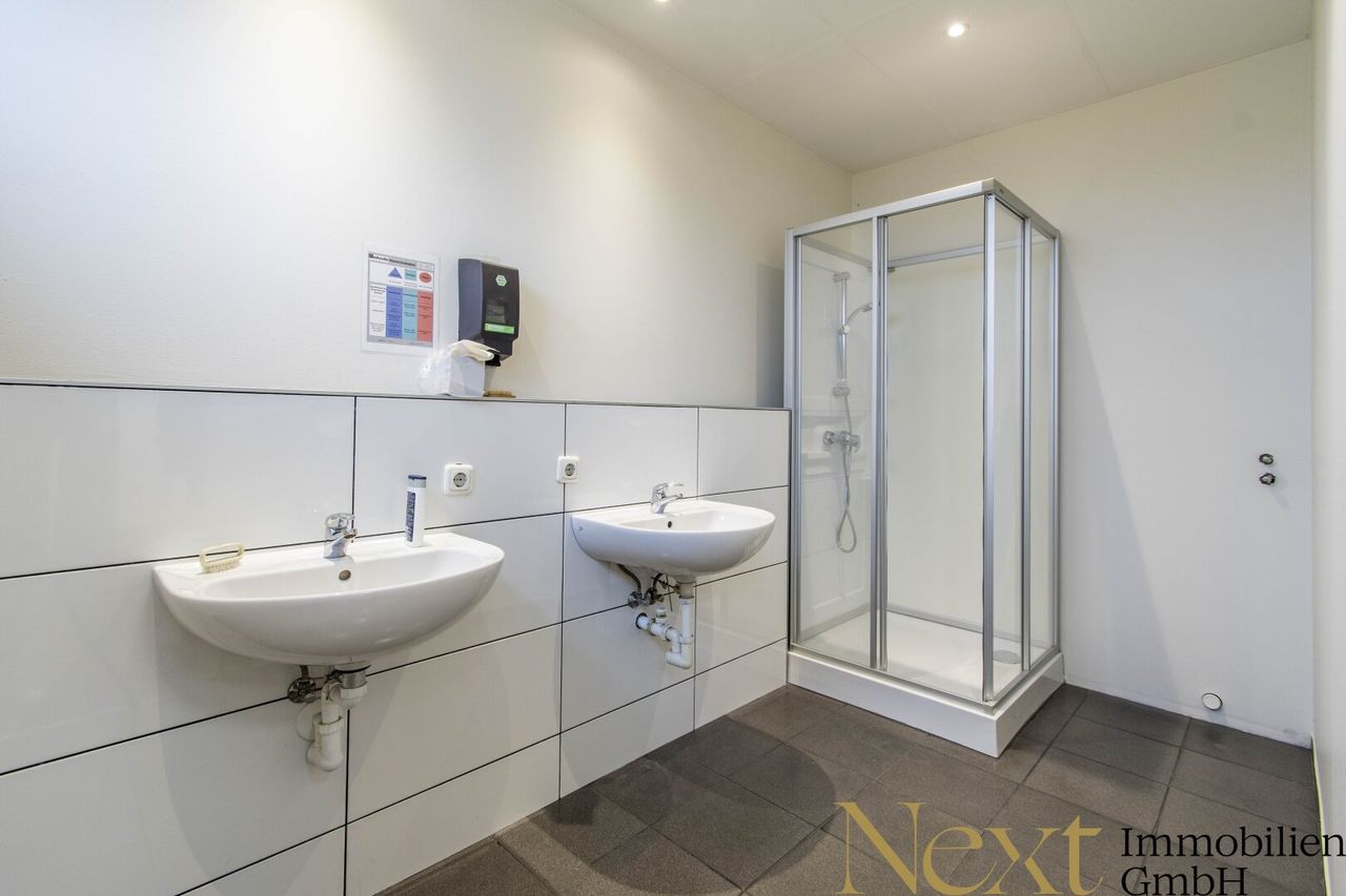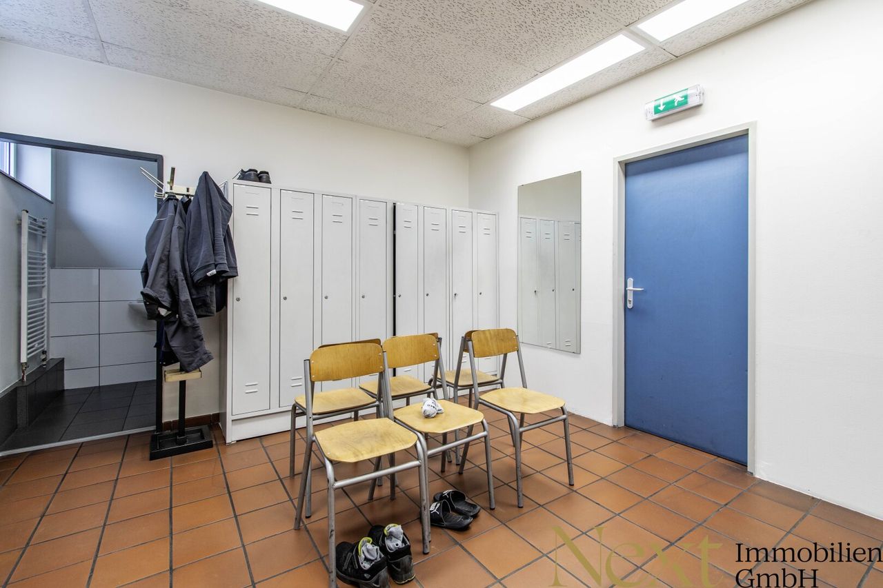 Das Erdgeschoss überzeugt durch eine großzügige Lagerfläche, die durch Büroräume und Sanitäranlagen ergänzt wird. Im Obergeschoss befinden sich komfortable Mitarbeiterräumlichkeiten, darunter Umkleiden, separate Sanitärbereiche für Damen und Herren sowie ein Aufenthaltsraum mit Teeküche, der genügend Platz für erholsame Pausen bietet.
