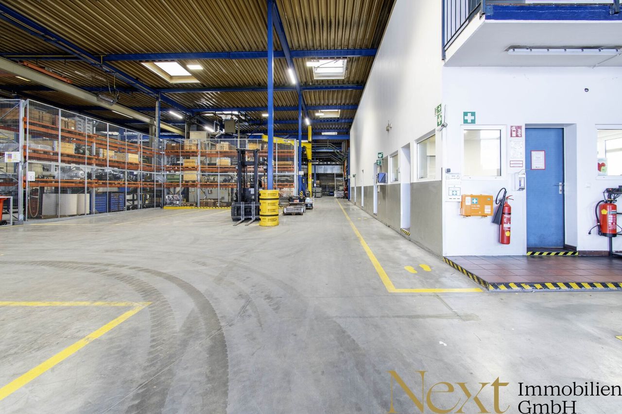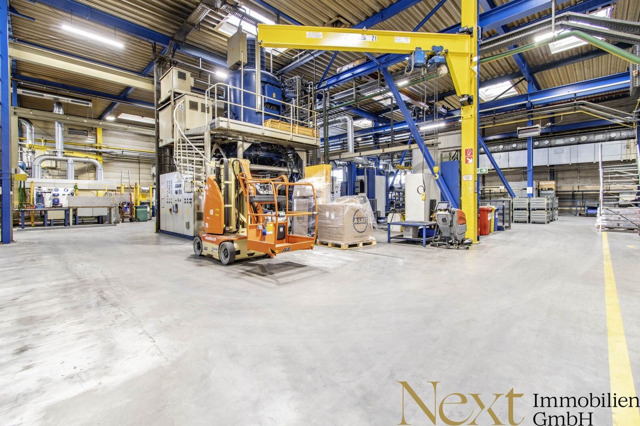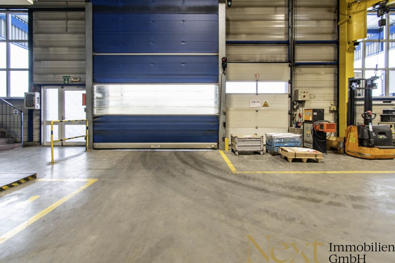 Die beheizte Lagerhalle überzeugt mit einer Höhe von ca. 7,92m und verfügt über sechs Kräne mit folgenden Traglasten: 500kg, 1t, 1,8t, 2t, 2 x 5t, die im Objekt verbleiben. Zwei Rolltore mit Abmessungen von 2,35m b x 3m h und 3,90m b x 3,10m h sowie ein Flugdach (Höhe: 4,90m, Breite: 8,50m, Länge: 18m) sorgen für zusätzliche Funktionalität.