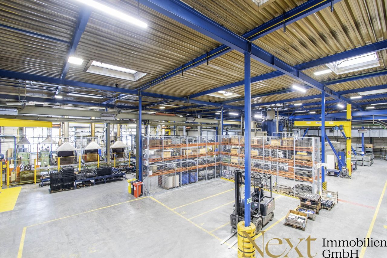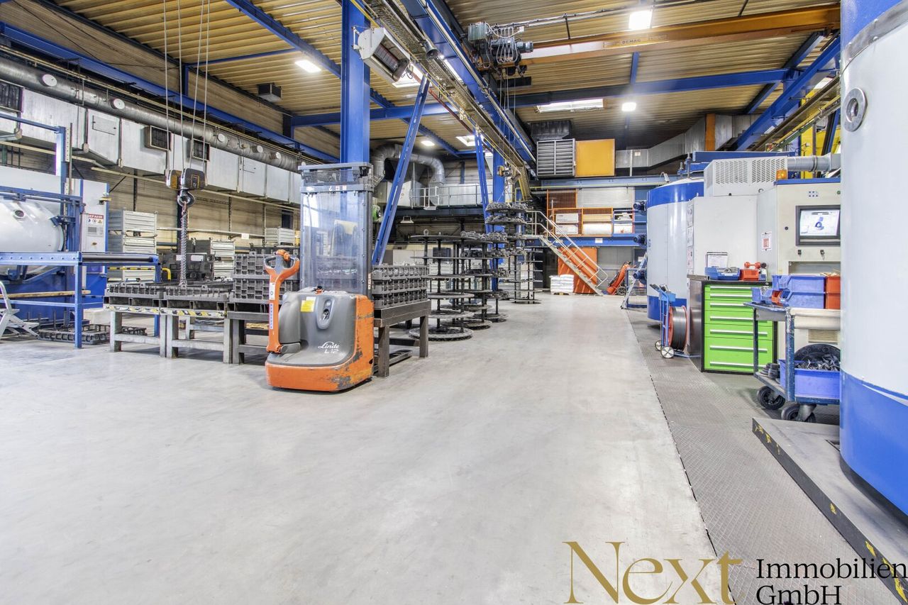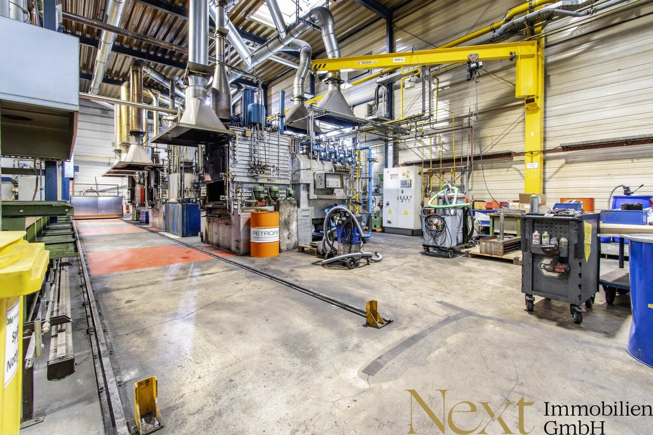 Die beheizte Lagerhalle überzeugt mit einer Höhe von ca. 7,92m und verfügt über sechs Kräne mit folgenden Traglasten: 500kg, 1t, 1,8t, 2t, 2 x 5t, die im Objekt verbleiben. Zwei Rolltore mit Abmessungen von 2,35m b x 3m h und 3,90m b x 3,10m h sowie ein Flugdach (Höhe: 4,90m, Breite: 8,50m, Länge: 18m) sorgen für zusätzliche Funktionalität.