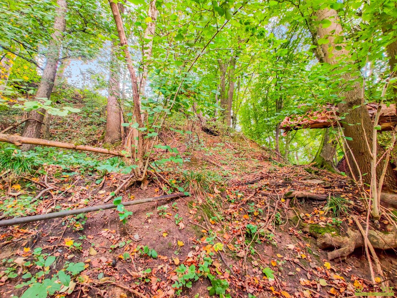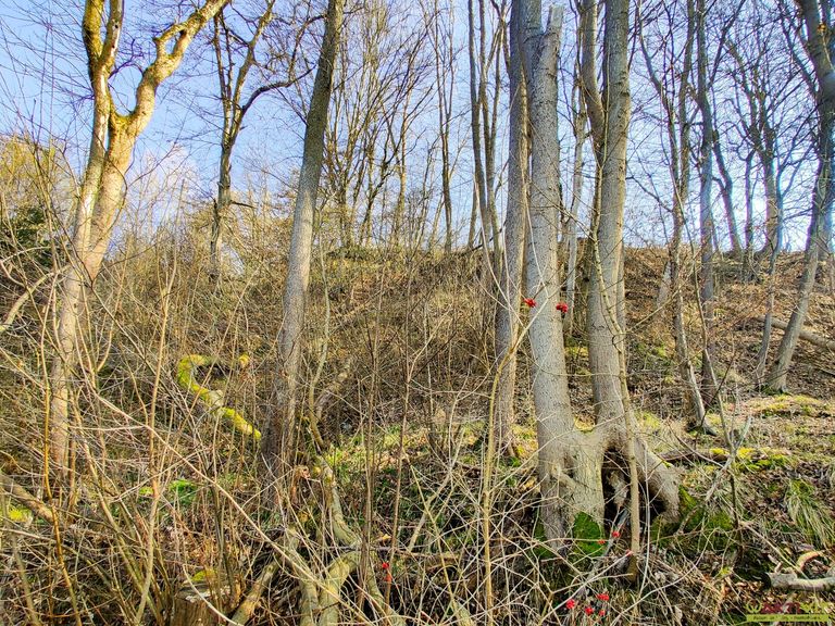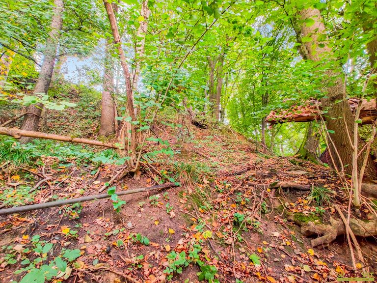 - Bestand an Hochwald mit Buchen, Eichen und Fichten (ca. 50–80 Jahre alt).