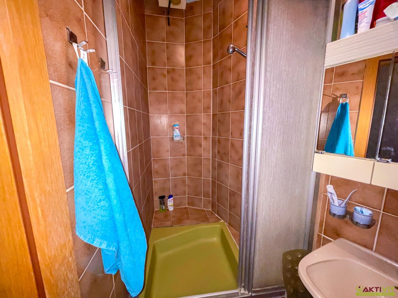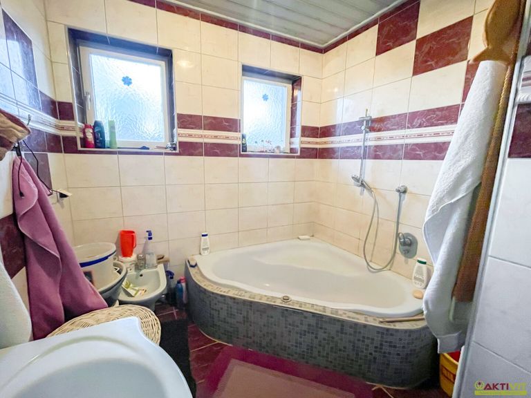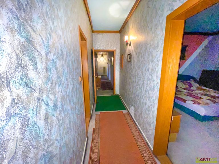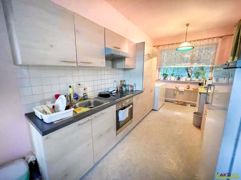 Im Inneren finden sich verschiedene Bodenbeläge wie Fliesen, Kunststoff- und Teppichboden. Das Objekt ist teilmöbliert, inklusive einer Einbauküche sowie Badezimmerausstattung mit Dusche und Badewanne.