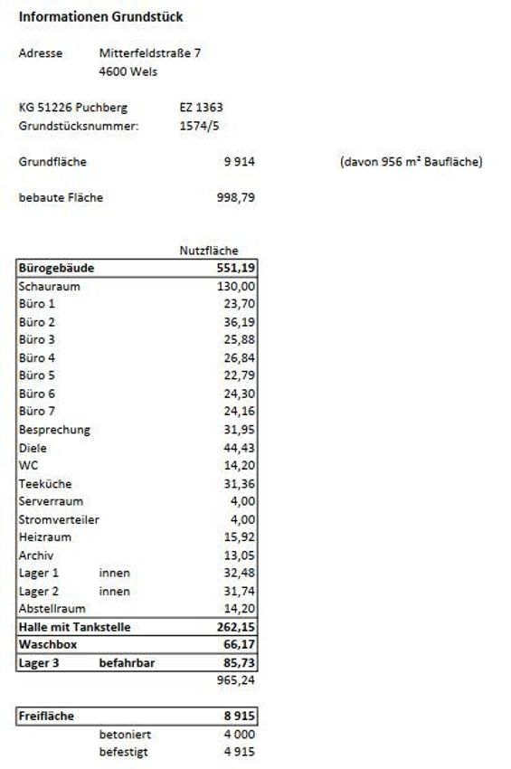 Ihre Chance! Betriebsobjekt mit reprästentativem Schauraum, Büroflächen, Lager- und Freilagerflächen, LKW Zufahrt, in der Widmung B ab Sommer 2025 verfügbar - Nahbereich Autobahnauffahrt Wels-Nord Lage: an der A25 (Welser Autobahn) in unmittelbarer Nähe von einem Baumarkt, einem Baustoffhandel, Lebensmittelgeschäften, Fachmarktagglomeration Wels - Nord Das Objekt besteht aus: Grundstücksfläche 9.914m² Bürogebäude inkl. Schauraum - in Summe 551,19 m² - davon 130 m² Schauraum Lagermöglichkeiten im Innen - und im Außenbereich Teeküche Besprechungsraum Halle mit Tankstelle (262,15 m²) Waschbox 66,17 m² sehr große betonierte/befestigte Freiflächen Heizung: Pellets verfügbar ab: Sommer 2025 Mietkonditionen: auf Anfrage seitens Eigentümerschaft wird ein Verkauf des Objektes ausgeschlossen...