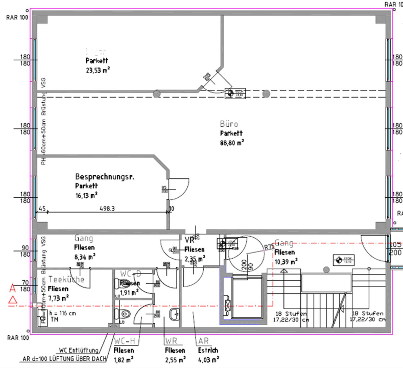 Auch mit der Straßenbahnlinie 26 sowie den Busverbindungen 22A, 24A, 31A ist der Arbeitsplatz direkt erreichbar. Ideal für jeden Dienstleistungsbetrieb, der Raumbedarf in dieser Größe hat. In der hauseigenen Tiefgarage ist ein Parkplatz anmietbar (ein weiterer nach Verfügbarkeit). Für etwaige größere Veranstaltungen können Sie auch den Seminarraum im 2. Stock des gleichen Gebäudes für ein geringes Entgelt halb- bzw. ganztags anmieten
