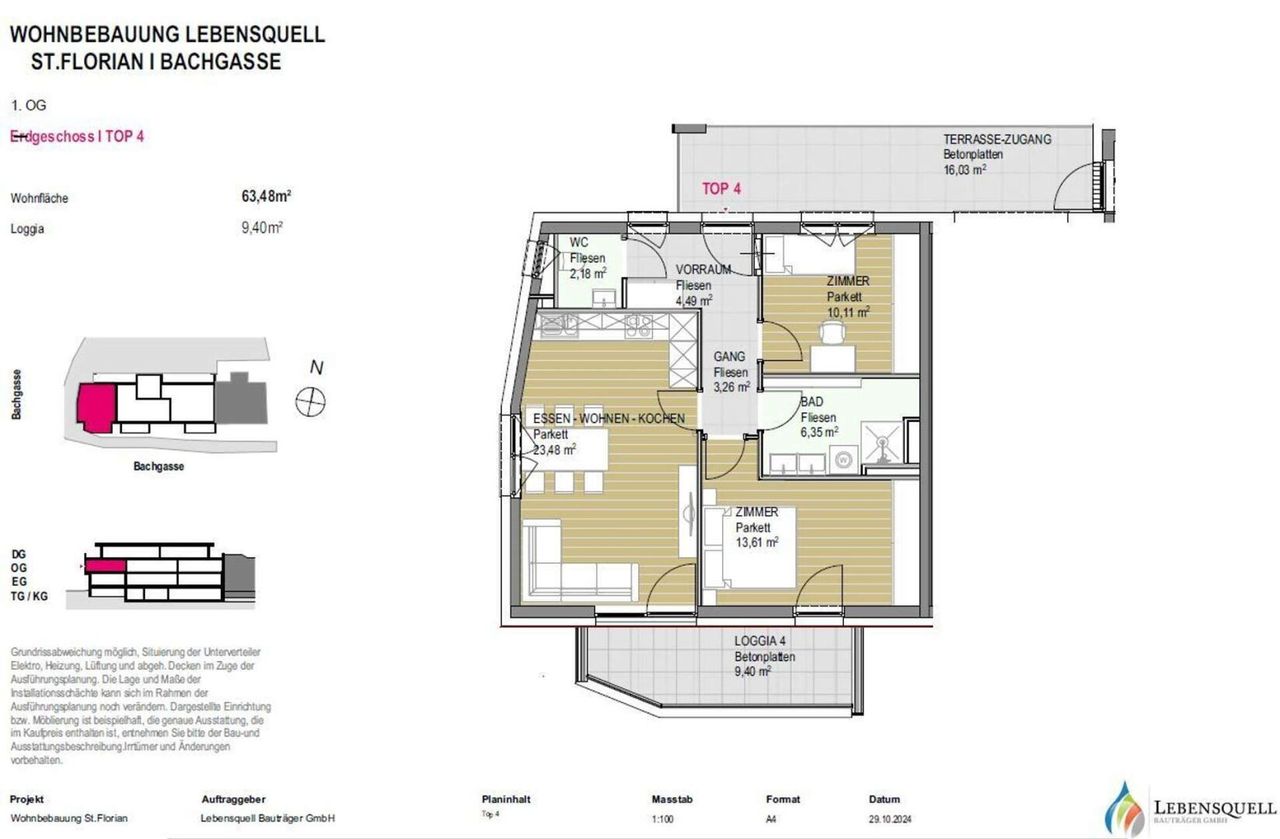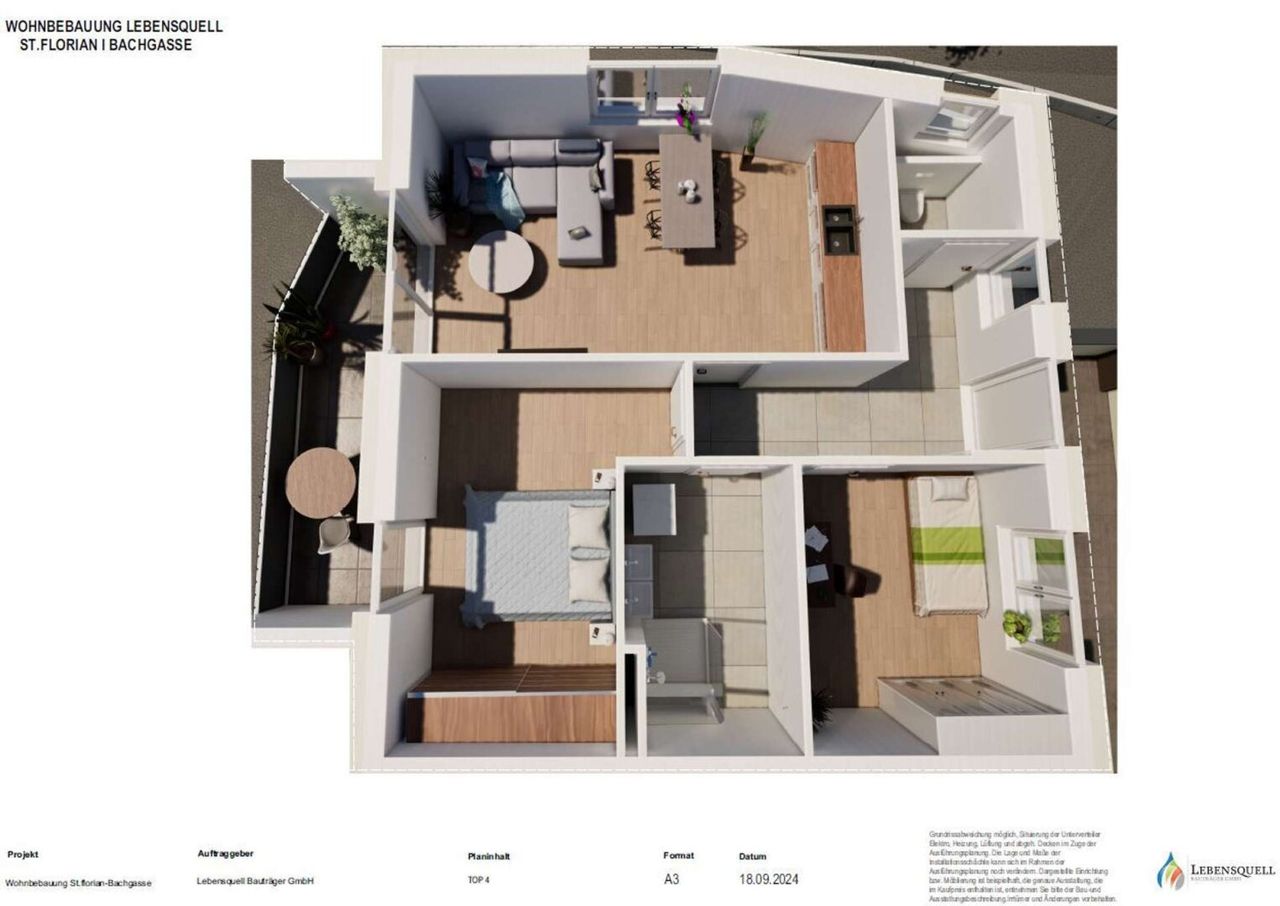 In ruhiger Zentrumslage von St. Florian wird der 2. Bauteil des Projektes "Grüner Baum" realisiert. Das attraktive, moderne Mehrfamilienhaus mit insgesamt 8 Wohneinheiten bietet maximalen Wohnkomfort mit durchdachter, zeitgemäßer Raumplanung. Besonderen Wert wird neben der hochwertigen Ausstattung auf eine verbesserte Energieeffizienz gelegt. Die Wohnung Top 4 liegt im 1. Obergeschoß mit einer sehr schönen Loggia nach Süden. Zusätzlich können Sie eine nahezu private Terrasse nutzen, die aufgrund des alleinigen Zugangs zur Wohnung entsteht und vom allgemeinen Teil durch eine Türe abgegrenzt wird. Die kompakte 3-Zimmerwohnung verfügt über eine sehr gelungene Raumaufteilung mit viel Tageslicht in den einzelnen Räumen.