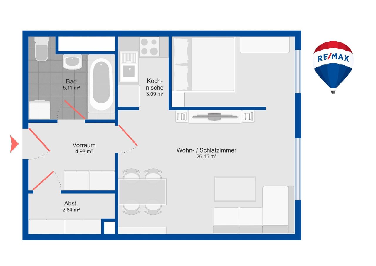 Die Wohnung verfügt über einen gut geschnittenen Grundriss mit einem Wohnzimmer samt eingerichteter Kochnische (inkl. E-Geräte), einem separaten Schlafzimmer, Bad mit Wanne, Vorraum sowie einem praktischen Abstellraum. Die Wohnräume sind mit Parkettböden ausgestattet, die Nassräume sowie der Vorraum sind verfliest. Kunststofffenster mit 2-fach Verglasung sorgen für gute Energieeffizienz.