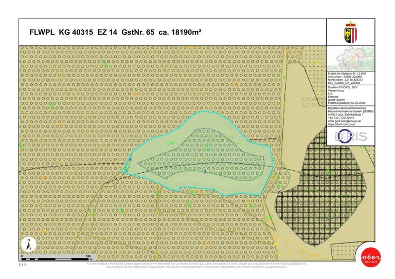 Die Parzelle 65 weist laut Stand des Grundbuchs vom 18.01.2022 insgesamt eine Größe von 18190m² auf und ist als Wald (Teilfläche 8280m²) und landwirtschaftliche Nutzfläche (Teilfläche 9910m²) ausgewiesen. Die oben genannte Parzelle hat eine Waldfläche die mittig der Parzelle liegt und gänzlich umgeben von landwirtschaftlicher Nutzfläche ist.