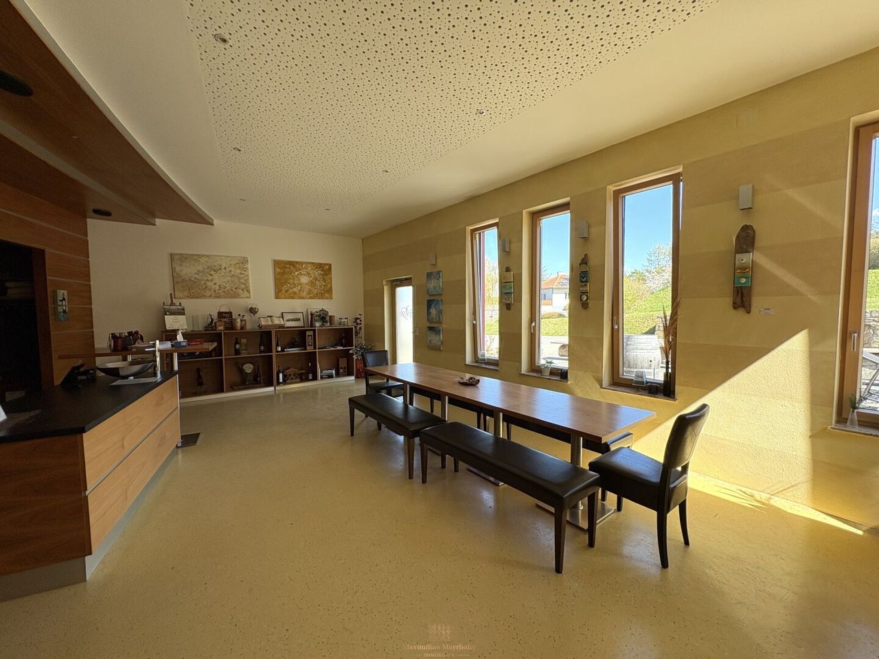 Ein stimmungsvoller, repräsentativ gestalteter Verkostungsraum rundet das Ensemble ab. Er dient als erste Adresse für Direktvertrieb, Degustationen und vinophile Veranstaltungen – vollständig eingerichtet und sofort betriebsbereit. Gerade der Direktvertrieb ab Hof stellt im österreichischen Weinbau einen der wertvollsten und margenstärksten Vertriebswege dar; ein professionell ausgestatteter Verkostungsraum dieser Qualität bildet dabei eine kaum zu überschätzende Infrastruktur.