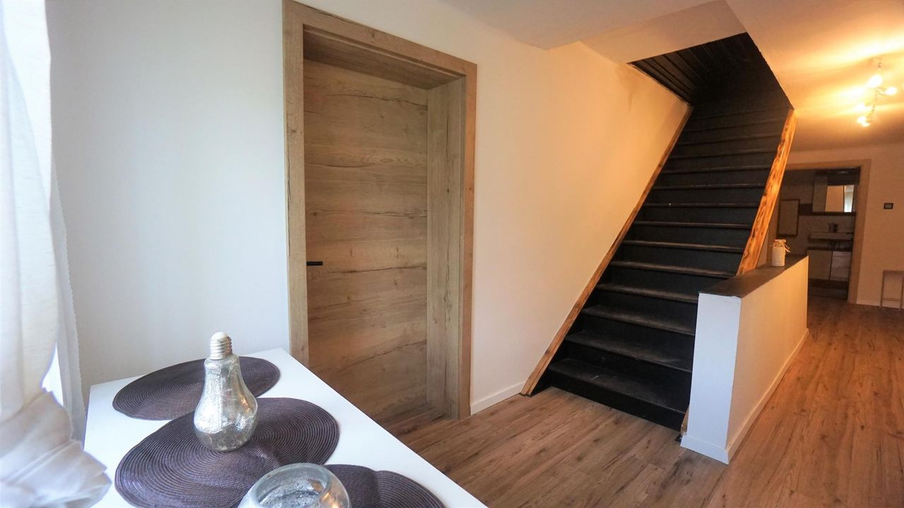 Erdgeschoß: Vorraum, Küche, Esszimmer leicht offen gestaltet zum großen Wohnzimmer, Bad mit Dusche, Badewanne, WC und Waschbecken und der Ausgang in den Garten.