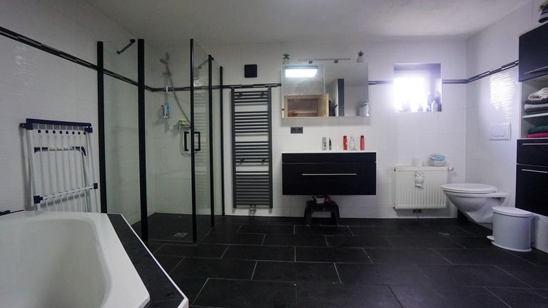 Obergeschoß: 4 Schlafzimmer und ein Bad mit Dusche, Wc und Waschbecken.